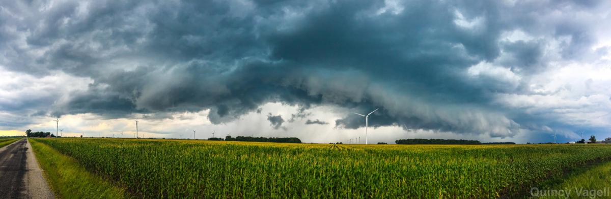 A shelf cloud associated with a strong thunderstorm hangs over a wind farm in rural northwestern Ohio. August 23rd, 2015.