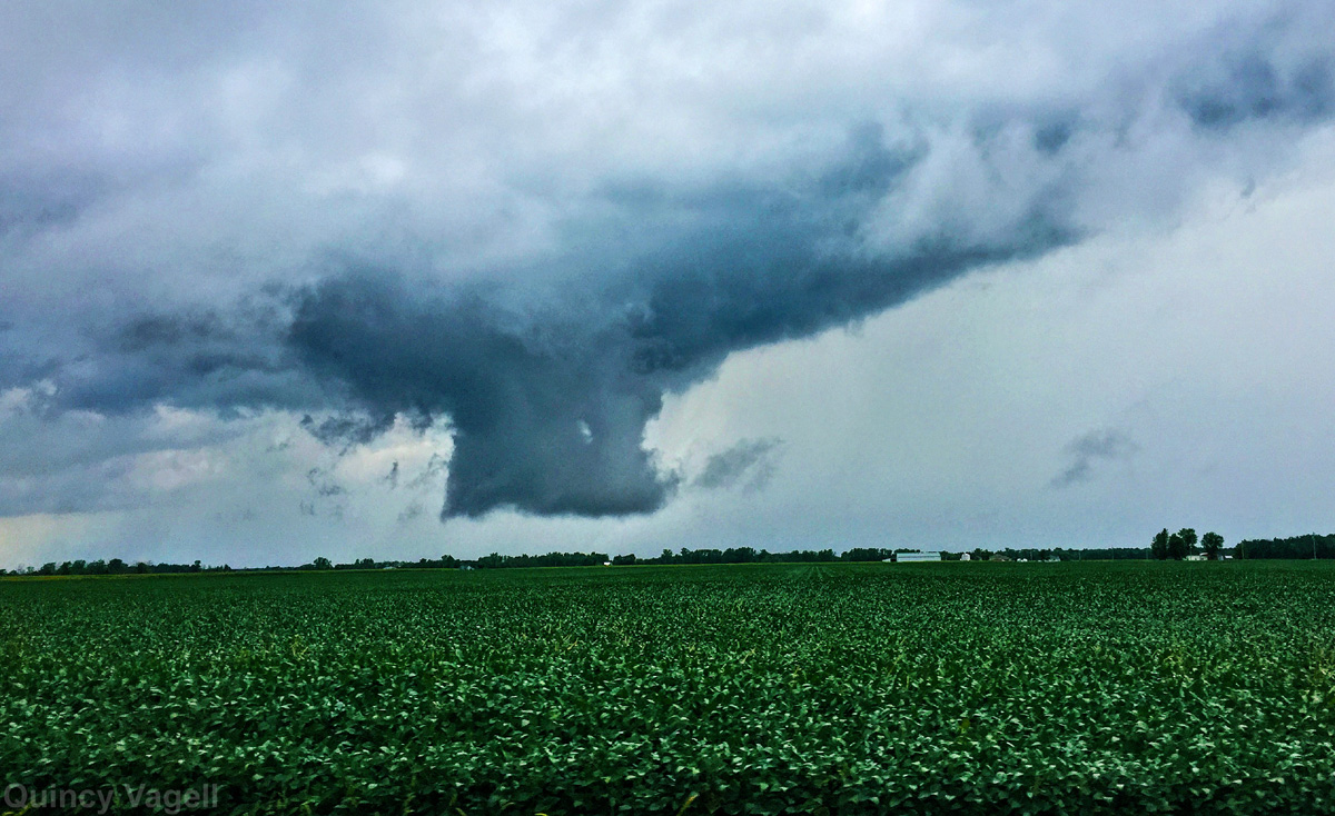 A short-lived wall cloud drops down close to ground level with a thunderstorm near Grover Hill, OH. August 23rd, 2015.