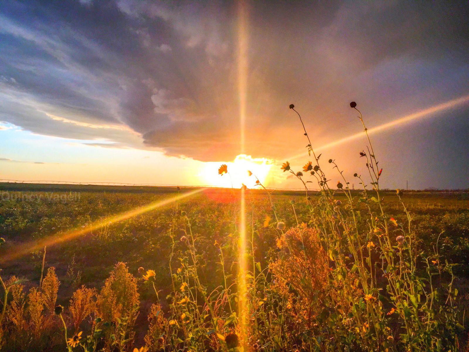 The sun lowers in the horizon beneath a severe, hail-producing thunderstorm near Memphis, TX. Sept. 20th, 2015.
