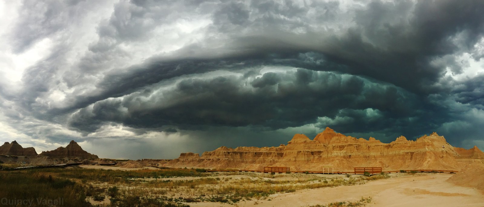 A shelf cloud approaches from the west over the Badlands of South Dakota. July 6th, 2016.