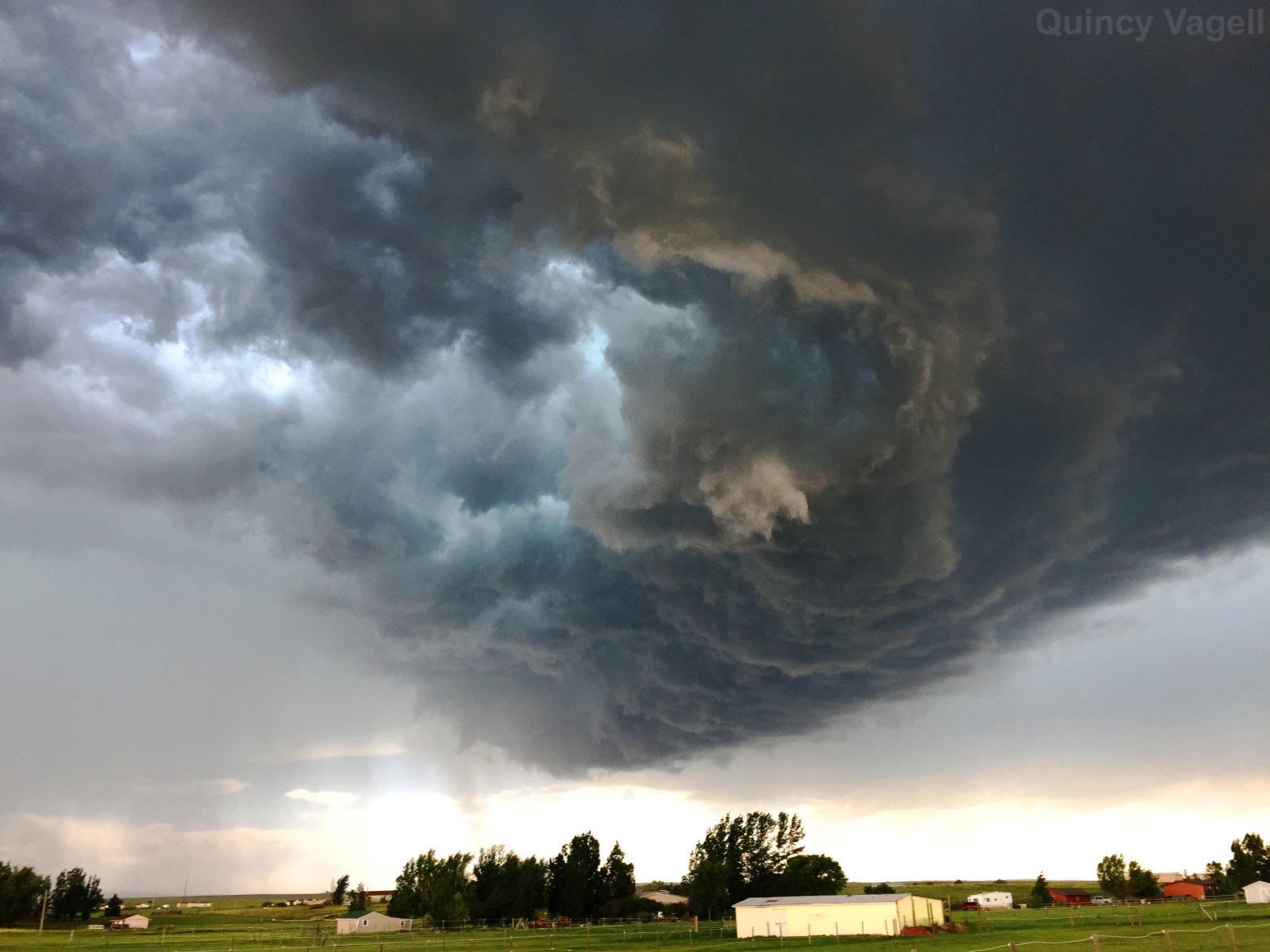 A tornado-warned thunderstorm near Colorado Springs, Colorado shows signs of low-level rotation as it passes overhead. July 8th, 2016.