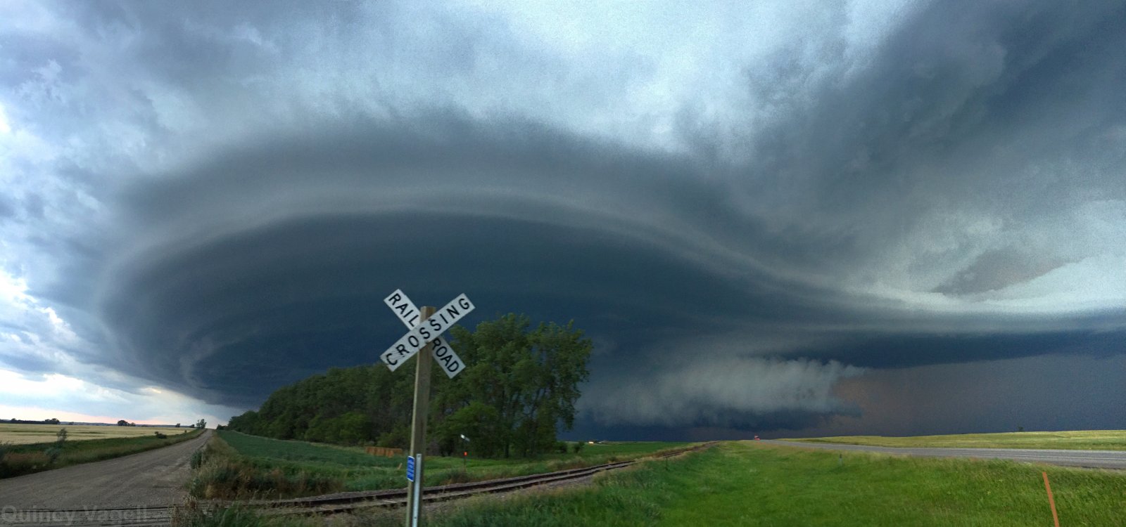 A rotating supercell thunderstorm slowly approaches from the northwest near Carrington, North Dakota. July 9th, 2016.