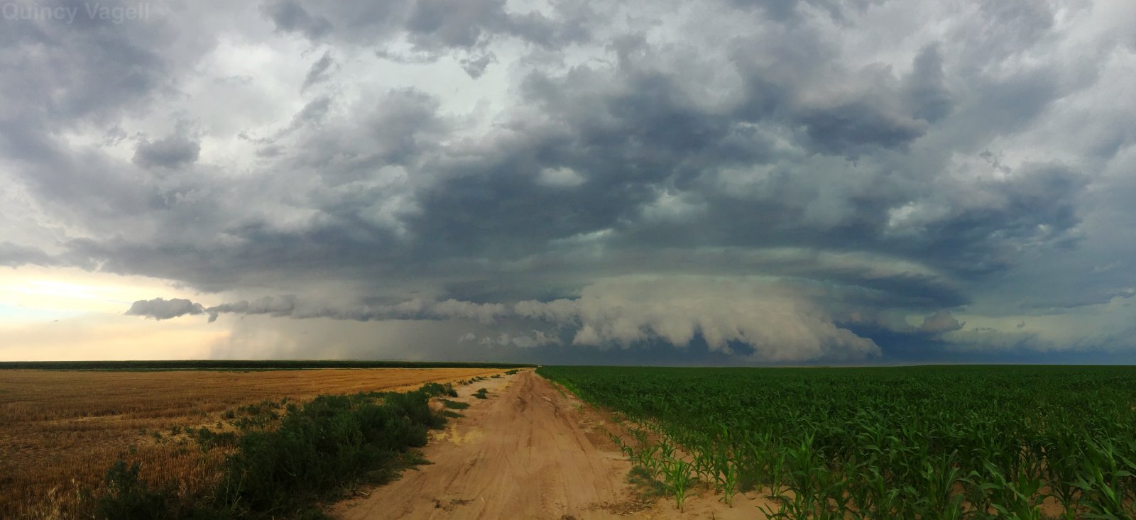 Panoramic view of a tornado-warned thunderstorm displays a low cloud base near Johnson City, Kansas. July 15th, 2016.