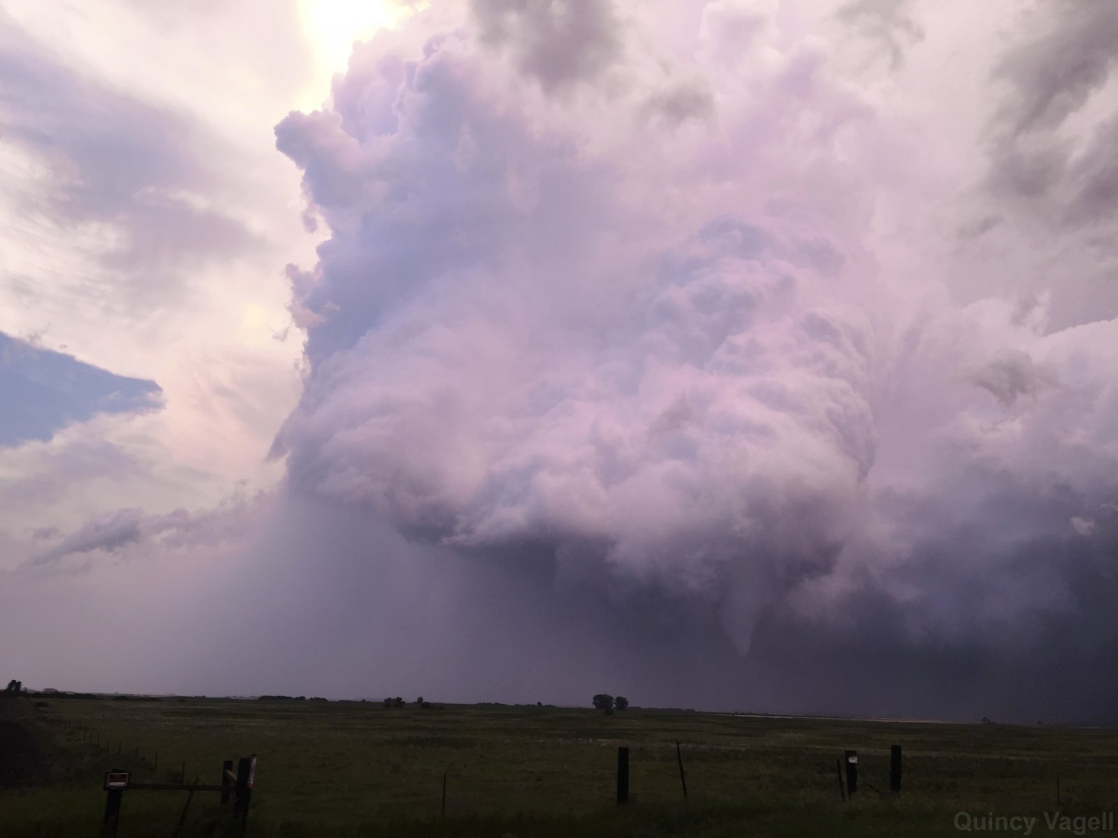A tornado-producing thunderstorm takes on a purple tint as the sun begins to set near Warwick, North Dakota. August 3rd, 2016.