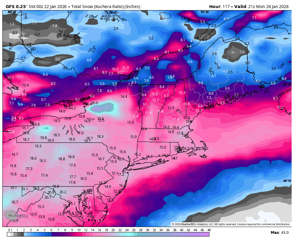 If anyone wants to have some extreme snow map fun, check out today’s Euro Weeklies & Weeklies Control for the next 32 and 46 days. I am not going to post them because I don’t want to muddy the waters with this current storm. But, my goodness they are truly impressive amounts. Bottom line is that this Sunday’s storm could just be the beginning of a great remainder of this Winter. -