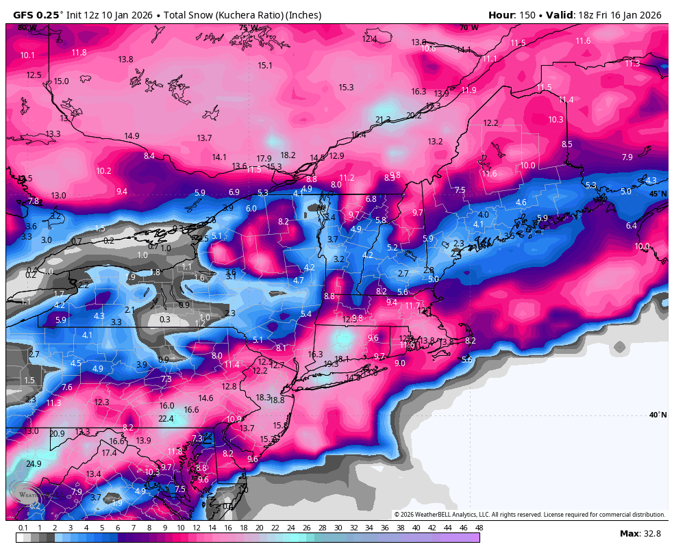 12z GFS says we could go 2 for 2 ! Second storm next Sunday this run produces another Warning level chance. This snow is ONLY for the Sunday storm chance. -