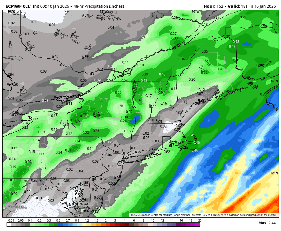 The good difference in the 12z Euro vs. the 0z Euro last night shows well in the 48 hr. total precipitation through Friday early afternoon. Quite the positive jump. -