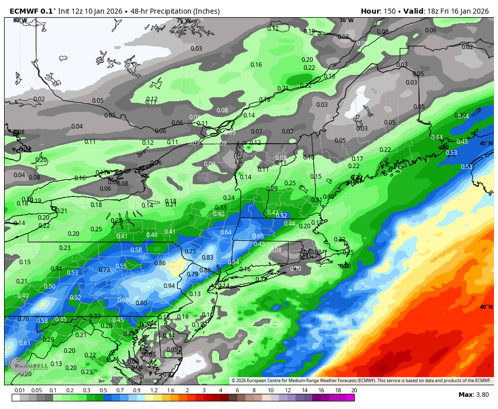 The good difference in the 12z Euro vs. the 0z Euro last night shows well in the 48 hr. total precipitation through Friday early afternoon. Quite the positive jump.