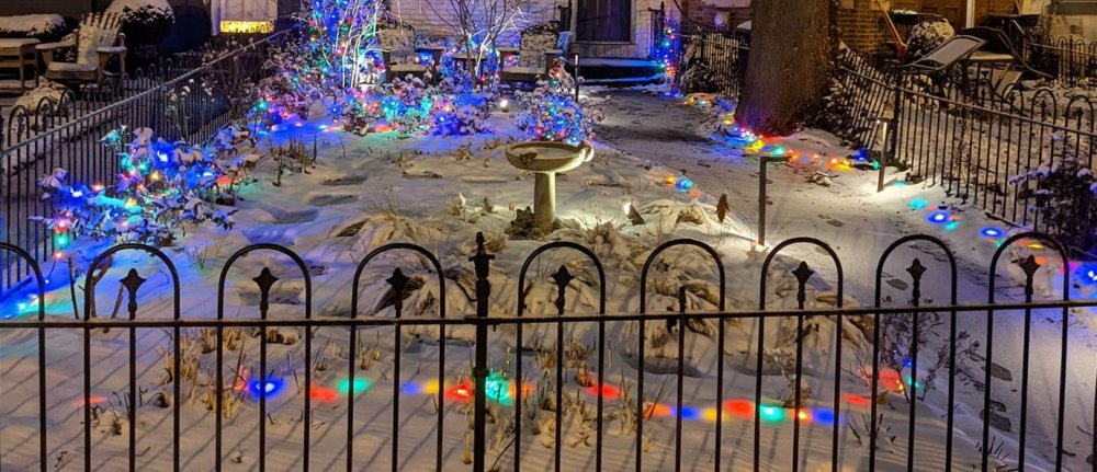 Re: lighting, I had my front yard completely renovated in summer 2019, and while the whole thing was extremely pricey, I am so glad I had wired lighting put in. Kind of hard to see it in this pic, but... (lights along the path and around the little patio close to the house, and up-lighting under the birdbath and the two service berry trees.