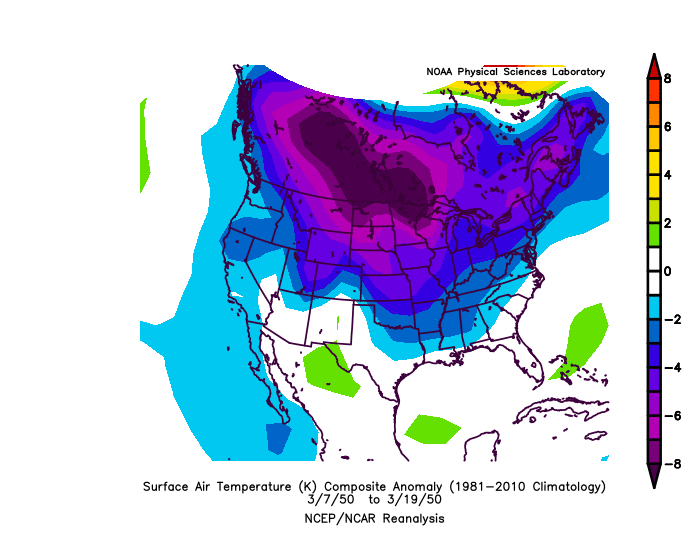 4. -EPO can be +8 in the upper levels, and below freezing at the surface. It's a below average temp pattern. -EPO with -NAO, which it should be, gives us snow, but the clouds are thin and it melts quickly. Both 2010 and 1950 had big -EPO's for a few days while transitioning away from -PNA. see how warm it is The 2 biggest -PNA's on record, in transition, both produced big -EPO's, 2/2