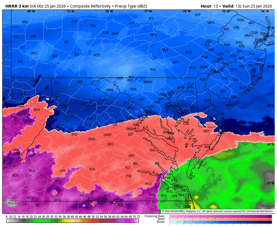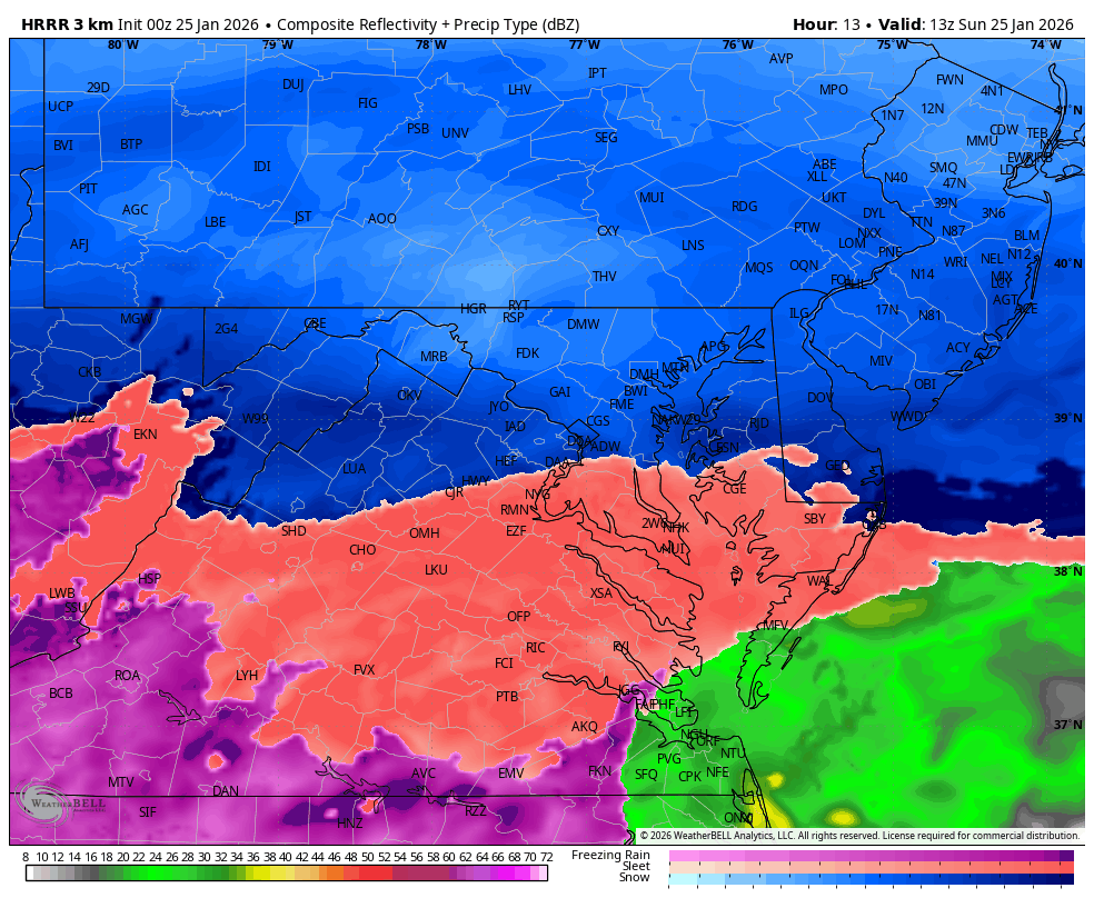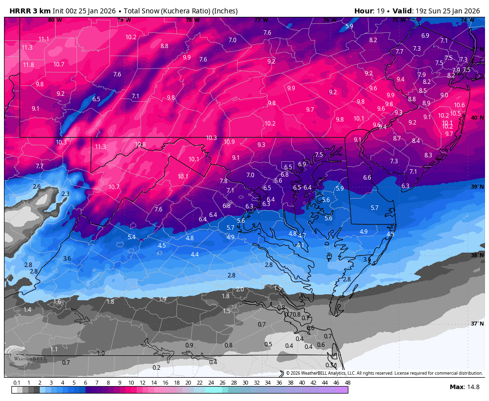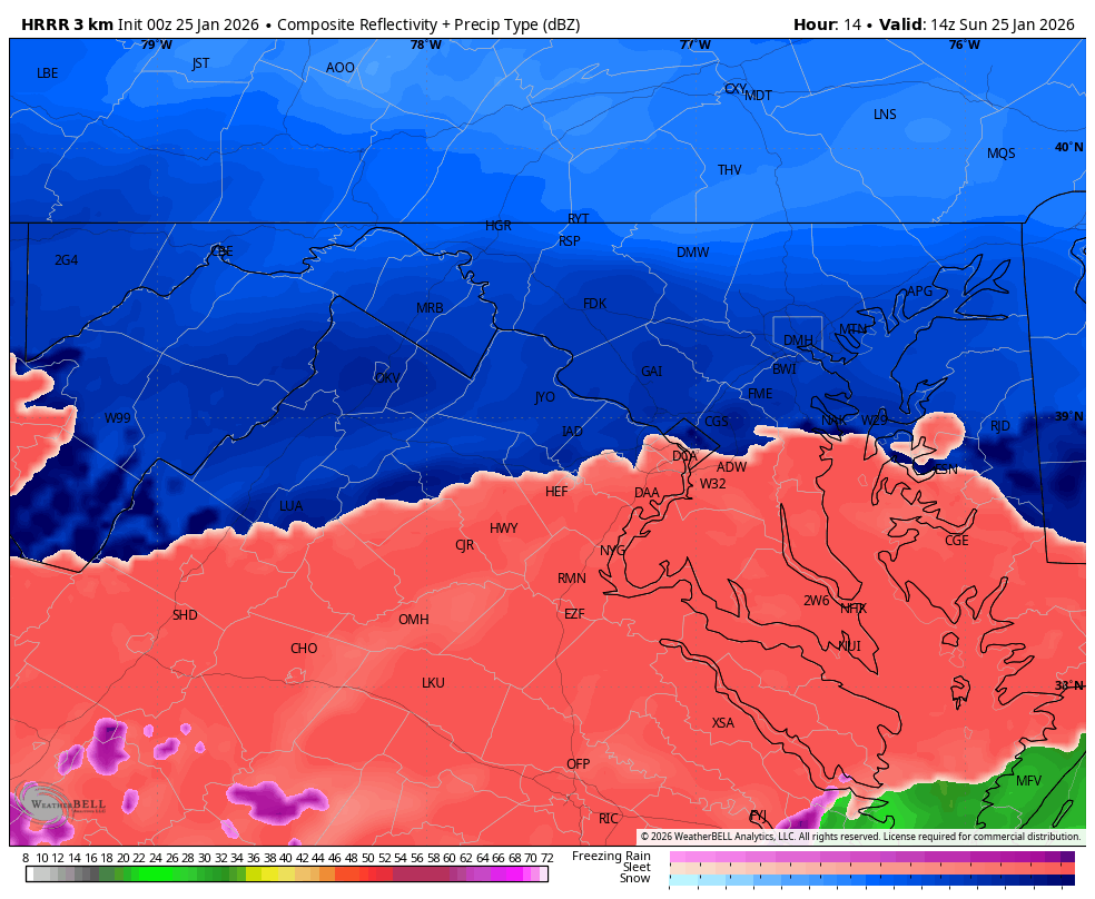 NWS keeping big totals in forecast for NW zones. ...MAJOR WINTER STORM WILL IMPACT THE REGION THIS EVENING THROUGH SUNDAY EVENING... .A large area of precipitation will overrun Arctic air in place over the Mid-Atlantic. This will lead to widespread significant snow beginning this evening, with the potential for ice Sunday especially south of Highway 50 and near and east of Interstate 95. In addition to the high threat for significant snow and ice, very cold temperatures are expected tonight through the middle of next week with sub-zero wind chills likely at times. MDZ003>005-502-VAZ028-030-031-040-501-505-WVZ050>053-504-250215- /O.CON.KLWX.WS.W.0001.260125T0400Z-260126T0900Z/ Washington-Frederick MD-Carroll-Central and Eastern Allegany- Frederick VA-Warren-Clarke-Rappahannock-Northern Fauquier-Western Loudoun-Hampshire-Morgan-Berkeley-Jefferson-Eastern Mineral- 115 PM EST Sat Jan 24 2026 ...WINTER STORM WARNING REMAINS IN EFFECT FROM 11 PM THIS EVENING TO 4 AM EST MONDAY... * WHAT...Heavy mixed precipitation expected. Total snow and sleet accumulations between 9 and 13 inches, with up to 16 inches possible in western Maryland. Ice accumulations up to a tenth of an inch, mainly across the northern Shenandoah Valley. * WHERE...Portions of north central and western Maryland, northern and northwest Virginia, and eastern and panhandle West Virginia. * WHEN...From 11 PM this evening to 4 AM EST Monday. * IMPACTS...Travel could be very difficult to impossible. * ADDITIONAL DETAILS...Snow will likely overspread the area tonight, becoming heavy at times with rates of one to two inches per hour possible at times. A mix with sleet or freezing rain is expected Sunday. Visibility of one-quarter mile or less is possible at times. A prolonged period of very cold wind chills continues this evening and lasting through the middle of next week. -
