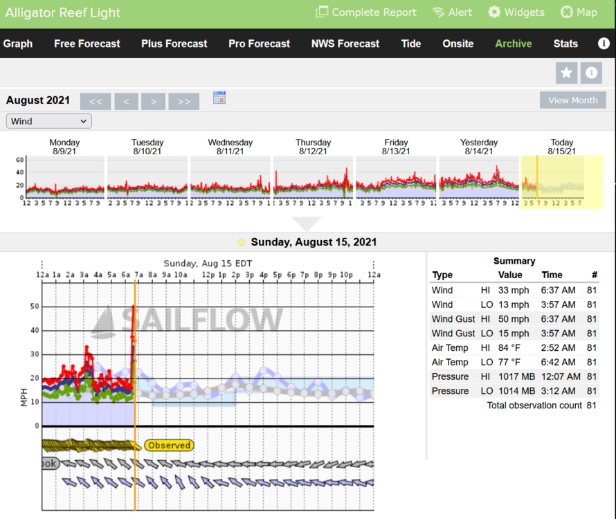 SailFlow is where I look. There was a 50 mph gust at Alligator Reef Lighthouse a few miles from there around 15 minutes later that I posted earlier. I'm sure it was a line of thunderstorms that passed over the eastern keys in an outer band. I would suspect a waterspout made this spike, but it appears the 60 mph winds lasted about 15 minutes or so which is more in line with a severe thunderstorm.