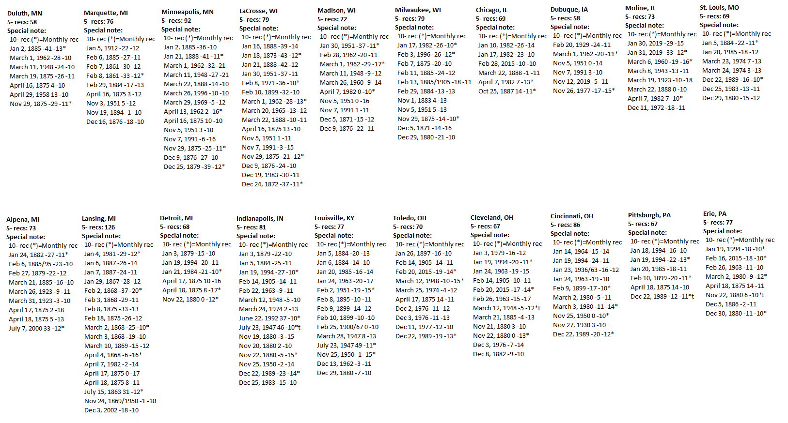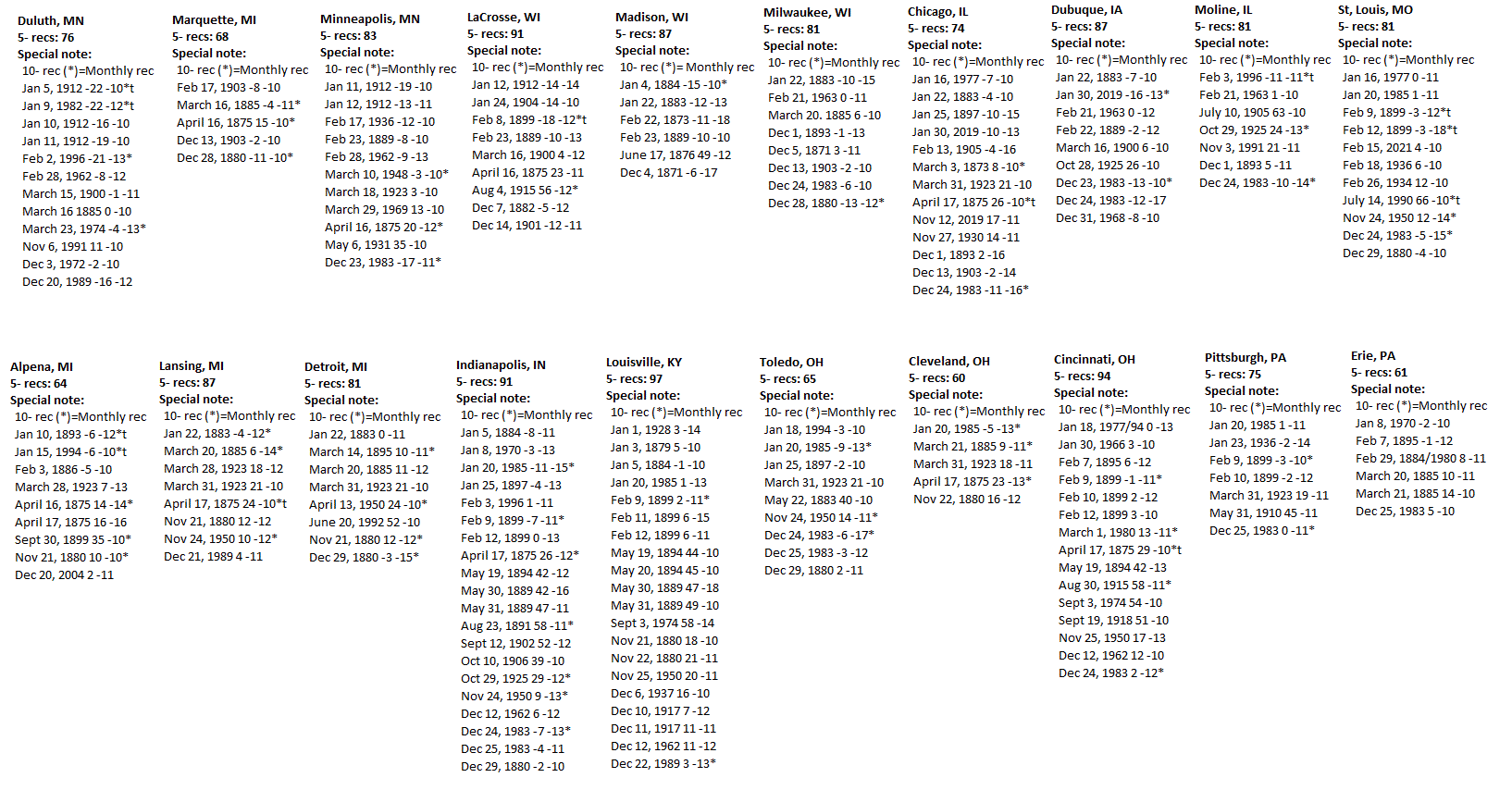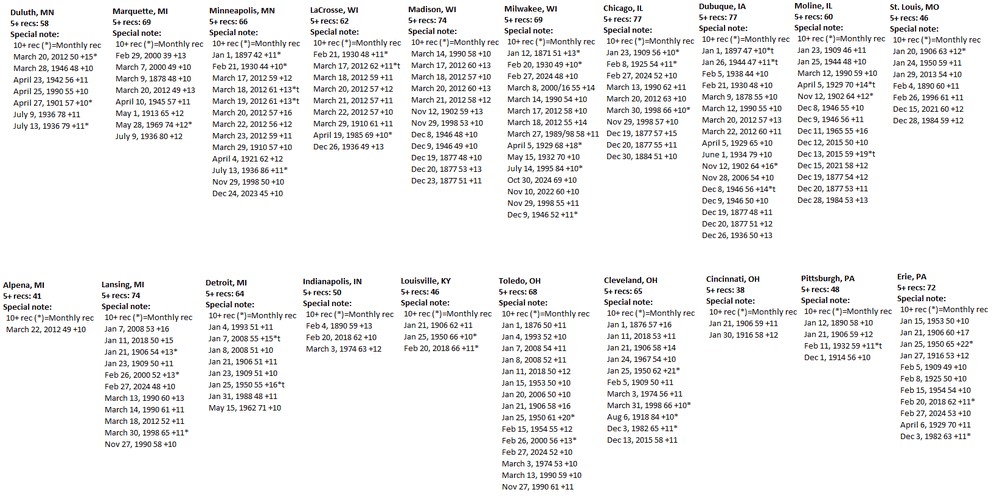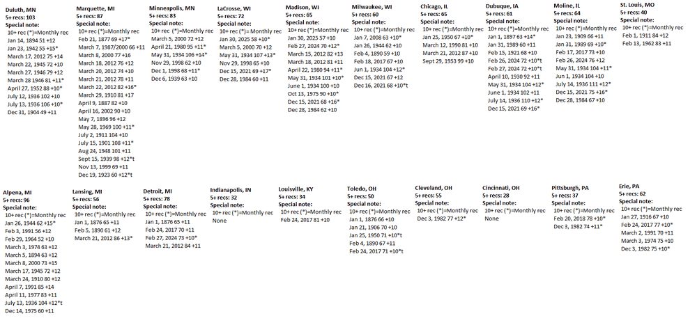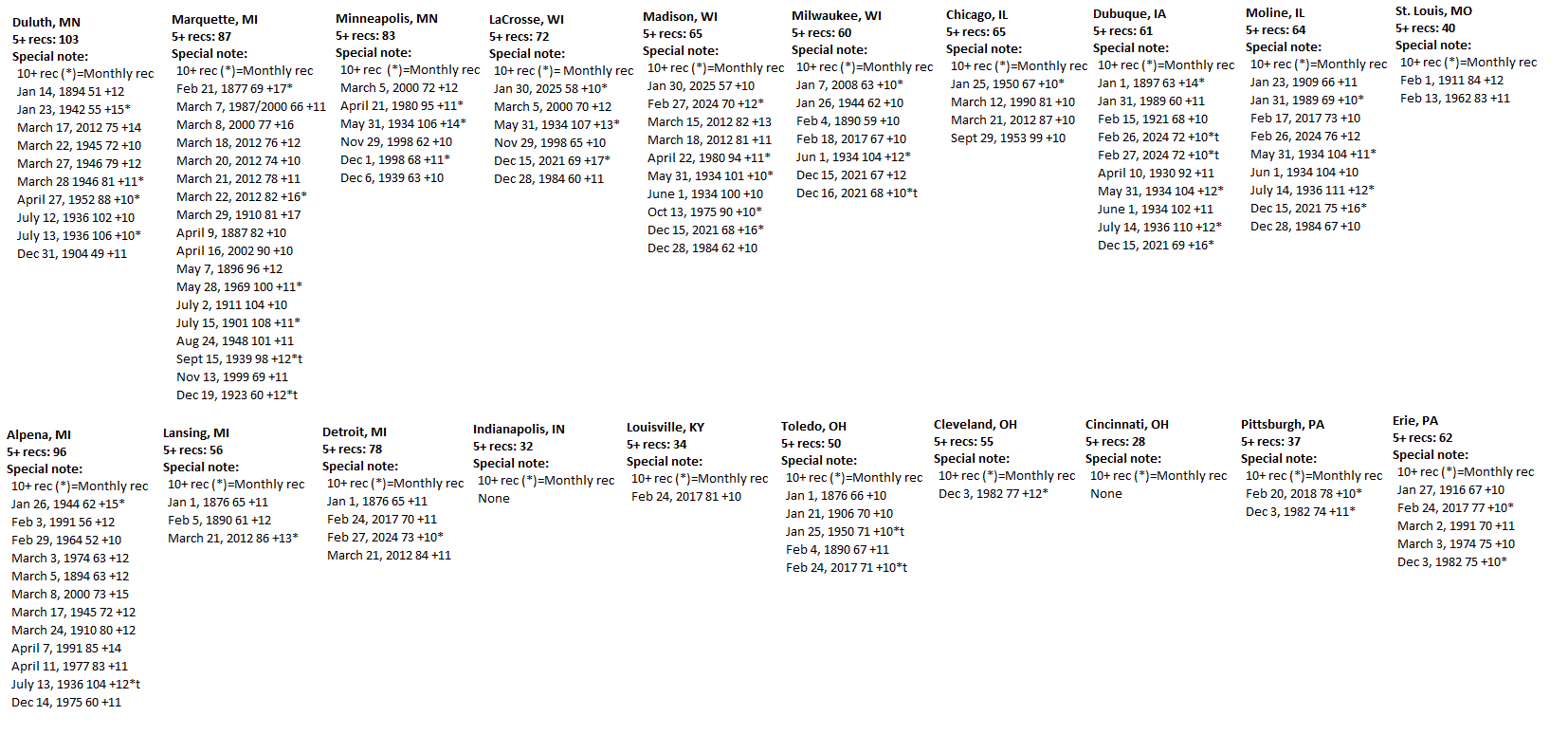 Finished updating my top 5/1/10 data for 2025. In the next few posts, I'll show how this current decade is progressing in Max, Hmin, Low Max, Min, and Precip extremes. Eventually, I'll add daily avg's. Already have that for DLH & MSP. Snow data is a trickier metric, so not sure if I'll do that or not. Data from 20 long period stns with start yrs from the mid 1870's n earlier. Duluth, Marquette, Minneapolis, LaCrosse, Madison, Milwaukee, Chicago, Dubuque, Moline, St. Louis, Alpena, Lansing, Detroit, Indianapolis, Louisville, Toledo, Cleveland, Cincinnati, Pittsburgh, and Erie. (Note: Just click the text portion below, and that'll pop up and make it easier to read.) Extreme Max temps