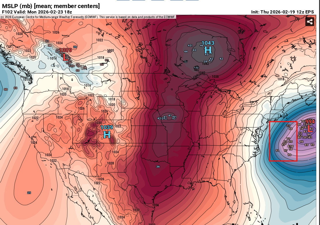 1. The main cluster of 12z EPS members are east of the 00z run, however the mean is pretty similar thanks to this small cluster of western members which move extremely slowly. I don't have access to the panels but I wouldn't be surprised if there are probably a few big hits in there.