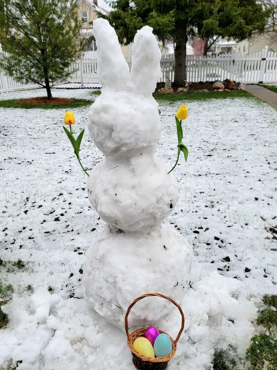 Woke up to bare ground for the first time since November 28th but snow showers all day have given a fresh coating. This neighborhood snowman must take ozempic