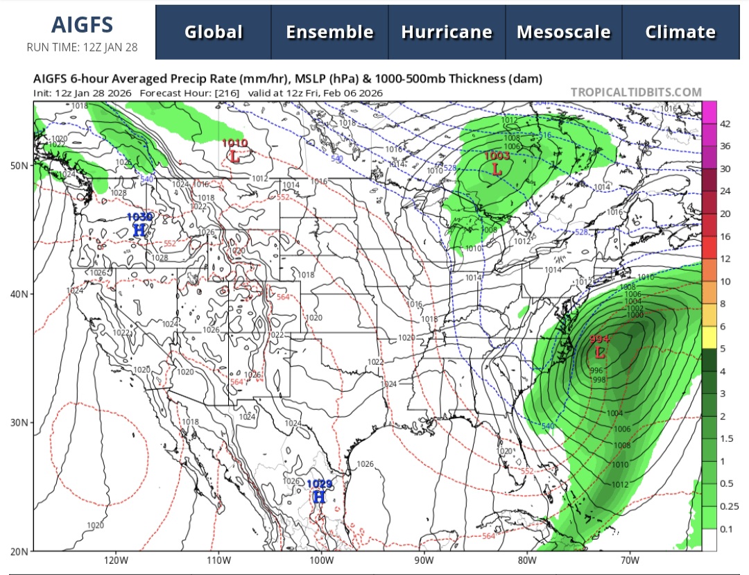 If we wind up with a period of strong northeast or east-northeast winds here, that will make a mess in terms of coastal flooding, but it will also introduce the possibility of some sound effect snow. Didn't check dT or wind direction, but it seems reasonable. Kinda rare, unlikely, but I'm grasping at straws here. Might work for the NJ coast. That one ephemeral depiction of a 950s benchmark blizzard with a 1040s high over the Midwest would have been something to tell our grandkids about. Maybe I'll tell them about the great model run of '26.