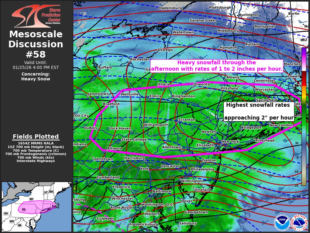 Mesoscale Discussion 0058 NWS Storm Prediction Center Norman OK 1055 AM CST Sun Jan 25 2026 Areas affected...northern Pennsylvania...southern New York...northern New Jersey...Connecticut...Rhode Island...and southern Massachusetts. Concerning...Heavy snow Valid 251655Z - 252100Z SUMMARY...Heavy snowfall is expected through the afternoon with rates up to 2 inches per hour. DISCUSSION...Widespread heavy snow is already ongoing across Pennsylvania and New Jersey this morning. This heavy snow will shift northeast through the afternoon. In addition, very heavy rates are expected to develop across far southeast New York, Connecticut, and Rhode Island. In this region, very strong 700mb frontogenesis is forecast between 18Z and 21Z amid strong isentropic ascent. In addition, amid strong warm-air advection, the transition zone from snow to sleet is moving rapidly north across eastern Pennsylvania and New Jersey (as sampled by KDOX Correlation Coefficient). Expect this transition zone to continue to advect north during the early afternoon before stalling near the Connecticut shore by mid-afternoon.