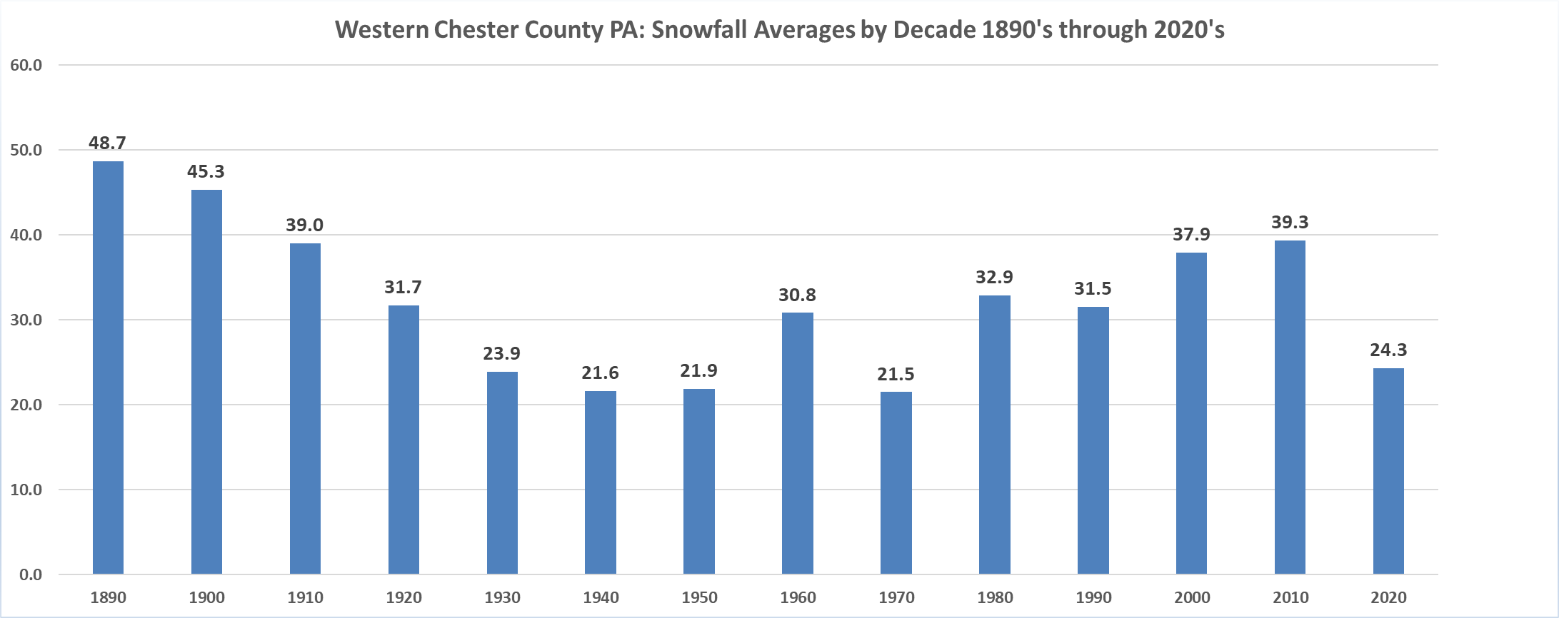 While the 2020's are less than our last very snowy 2 complete decades - we will likely not see such low totals as the true snow drought years back in the 1930's through 1950's and again in the least snowy decade the 1970's....simple cyclical weather patterns - rinse and repeat!!