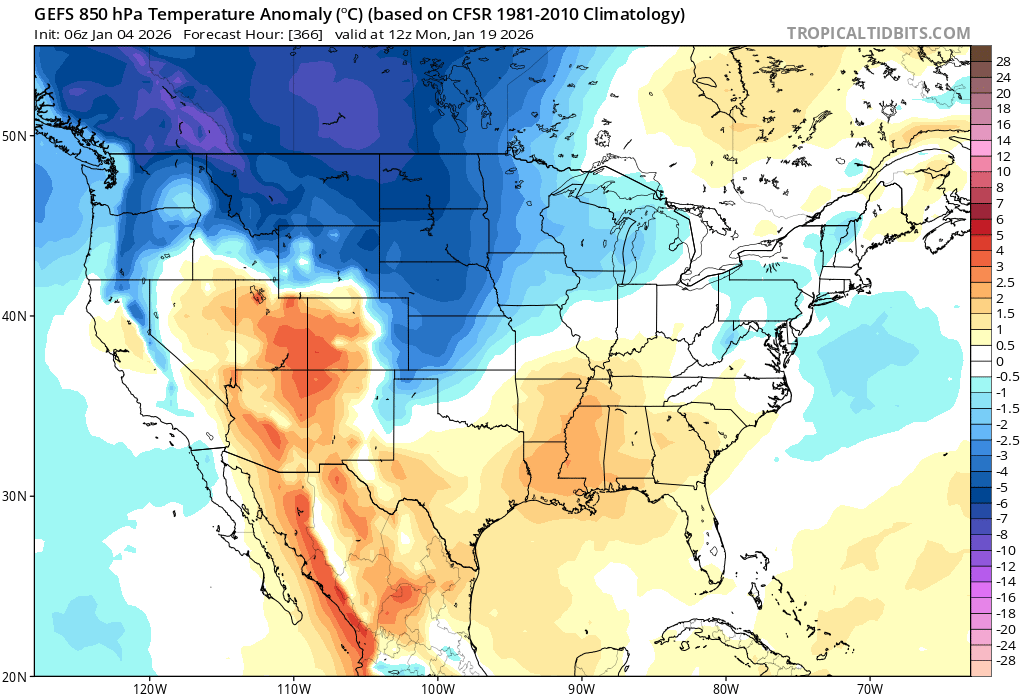 For anyone that wants to play along (disclaimer: i truly hate dissecting model data in the long range but for the sake of the sanity of some members...) .....this 500mb chart depicts a weak trof in the West and a flattened SER. Im not going to repeat what @CAPEand I have discussed repeatedly the past 3 or 4 days. Just because you see blue out west and red in the east does not spell disaster. Top map is the 500mb chart at 366, below that are the 2m and 850 temps respectively.
