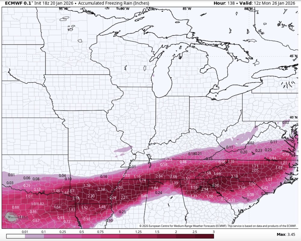 Massive icestorm down south. Some of those areas will be crushed and no power for weeks . And it’s cold after the storm too