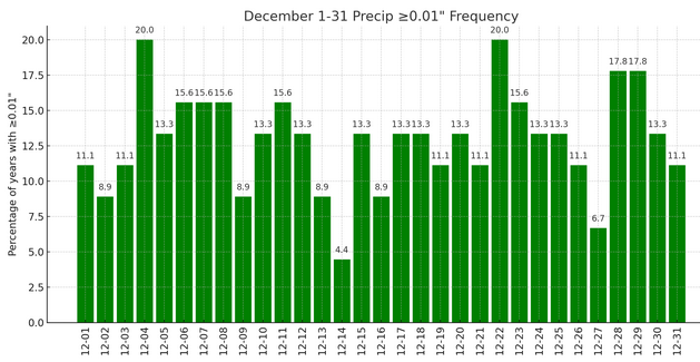 Washington, D.C.'s distribution of December days with measurable snowfall and the highest daily amount for each date. Highest percentage of 1" or above amounts: December 10 5.7% days (8 cases) Highest percentage of 6" or above amounts: December 24 1.4% days (2 cases)