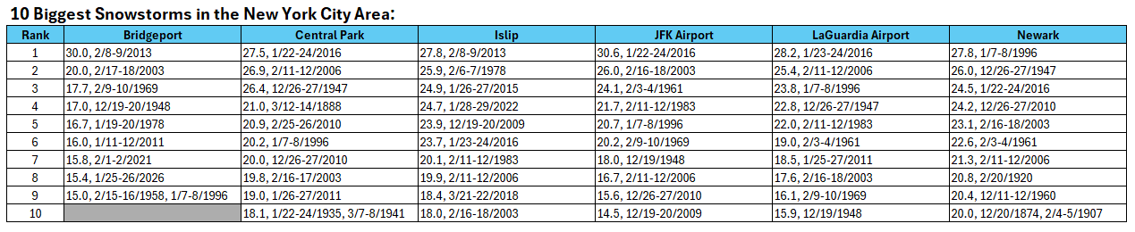 Following a day when springlike warmth brought about a torrent of melting and hint that the worst of winter is now in the past, a major blizzard is poised to engulf the region in a blinding, swirling wall of white. Last Tuesday, the AIFS signaled a possible major storm. Afterward, when all the other guidance retreated, the GFS kept the torch burning. Now, the region is set to experience its most severe blizzard in perhaps a decade. A rapidly developing storm will bring heavy snow and high winds to the region later tomorrow into Monday. Any early snow or mixed precipitation during the morning will be light and inconsequential. At present, a 16"-22" snowfall appears likely in New York City and its nearby suburbs. Somewhat lesser amounts are likely north and west of New York City. A 18"-24" snowfall is likely across central New Jersey and part of Long Island. Blizzard conditions are likely at the height of the storm late Sunday night into Monday morning across much of the region. Winds will likely gust near 60 mph creating extremely low visibilities and large drifts. Final estimates: Allentown: 8"-12" Atlantic City: 8"-16" Baltimore: 4"-8" Binghamton: 2"-4" Boston: 18"-24" Bridgeport: 14"-20" Harrisburg: 4"-8" Hartford: 8"-12" Islip: 18"-24" New York City: 16"-22" Newark: 16"-22" Philadelphia: 12"-18" Providence: 18"-24" Scranton: 3"-6" Washington, DC: 3"-6" Wilmington: 12"-18" As a result, Winter 2025-2026 will become just the 10th winter with two 10" or above snowstorms in New York City. The others are 1895-1996, 1925-1926, 1960-1961, 1977-1978, 1995-1996, 2003-2004, 2009-2010 (3 such storms), 2010-2011, and 2013-2014. Even more impressive, Winter 2025-2026 will be on track to join Winters 1960-1961 and 1977-1978 as the only winters with two or more 10" snowstorms, a seasonal mean temperature of 32° or below and seasonal snowfall of 30.0" or above. The ENSO Region 1+2 anomaly was +0.7°C and the Region 3.4 anomaly was -0.2°C for the week centered around February 11. For the past six weeks, the ENSO Region 1+2 anomaly has averaged -0.03°C and the ENSO Region 3.4 anomaly has averaged -0.47°C. Neutral ENSO conditions are now developing. Neutral ENSO conditions will develop during the close of winter. The SOI was +3.70 today. The preliminary Arctic Oscillation (AO) was -0.601 today. Based on sensitivity analysis applied to the latest guidance, there is an implied near 100% probability that New York City will have a cooler than normal February (1991-2020 normal). February will likely finish with a mean temperature near 31.7° (4.2° below normal). Supplemental Information: The projected mean would be 3.6 below the 1981-2010 normal monthly value. Overall, Winter 2025-2026 is on track for a seasonal mean temperature of 32.0°. If a 32.0° or below seasonal mean temperature occurs, that would be the lowest winter mean temperature since Winter 2014-2015 when the mean temperature was 31.7°. Winter 2025-2026 would only become the fourth winter of the 21st century with a mean temperature of 32.0° or below. -