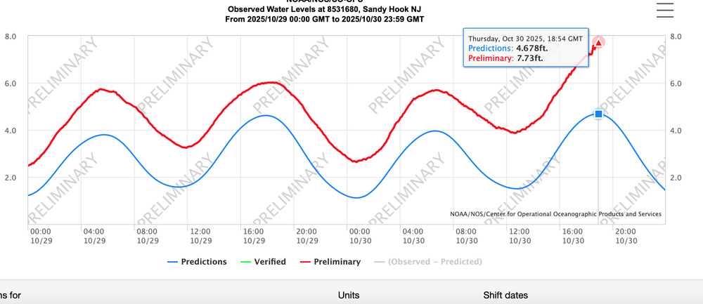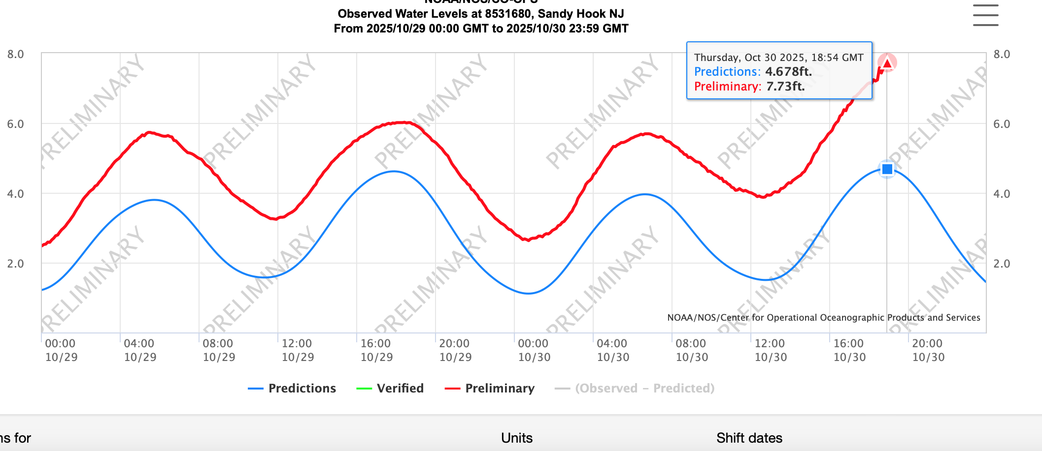 Sandy Hook briefly leveled at Moderate flood level 7.7' MLLW a few minutes ago. a 3' surge due to lowered pressure and timing of max gust 50 MPH inflow.