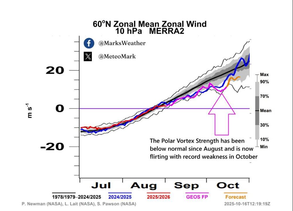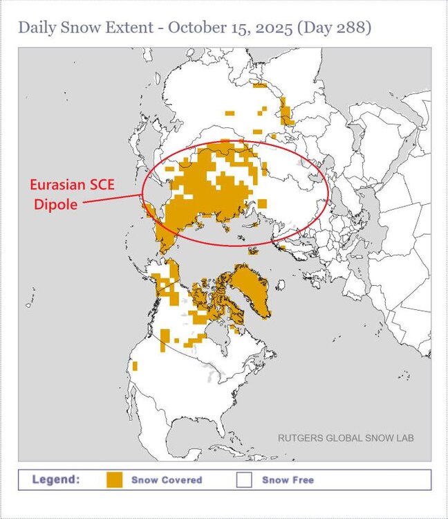 Also to note the Eurasia SCE is looking really really good through mid month so far in October. From Mark Margavage meteorologist, Winter Feedback Mechanism An Extremely Prominent Dipole Pattern has developed in Eurasian Autumnal Snow Cover Extent as of October 15th. IF IT HOLDS, this pattern of Autumnal Eurasian SCE puts a lot of pressure on the Polar Vortex resulting in frequent wave reflections causing arctic outbreaks into Eastern North America during winter. Also the PV being weak is a great sign for this winter that is why we are seeing some impressive dips with the AO and NAO already. If things continue this would be a big positive for our Winter around here. Sent from my SM-G998U using Tapatalk