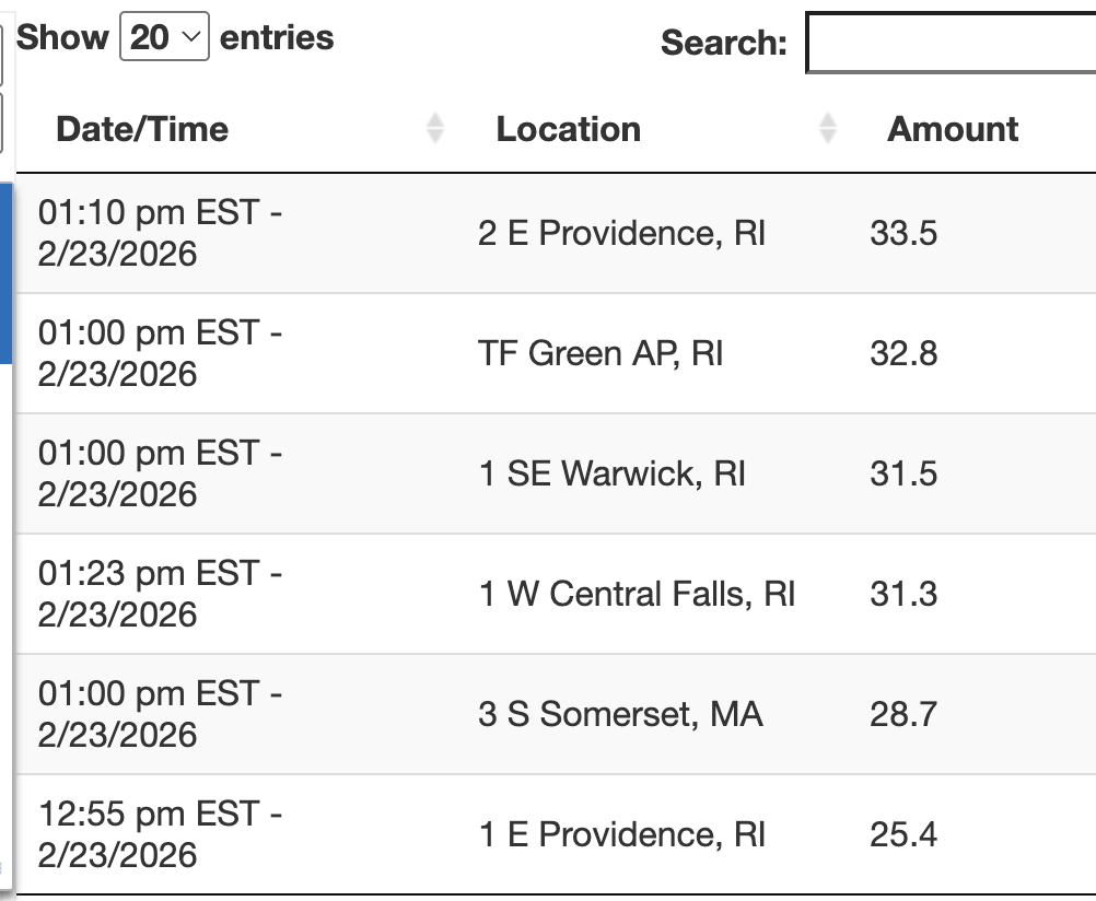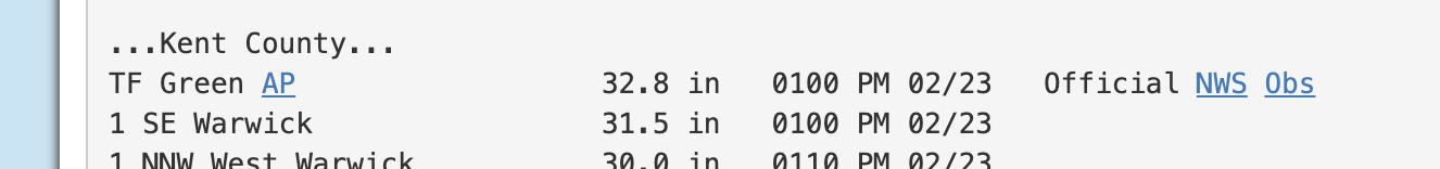 3. OK. That's Warwick, even though it's "PVD" or "KPVD" by code. Providence will be a little lower amount at the moment. Still amazing. I can't find the website for it but will get there. Only found this: https://www.weather.gov/wrh/timeseries?site=kpvd That would be 37" on the ground in Warwick. I believe 5" was already there.