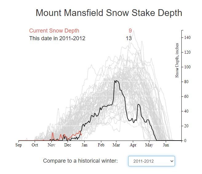 This is a bit anecdotal but still quite interesting. I always like to compare the high peaks snowpacks as a consistent metric for the intensity of our winter. These higher elevation locations are less susceptible to quick warmups and thus give a nice average of where things stand. Unfortunately, high peaks snowpack in the Northeast is flirting with all time record low territory. Sadder yet, I can only find a couple years where snowpack on this date is as low as it is now....... the dreaded 2015-2016 season, and 2011-2012 season. Basically the 2 most recent years without winter for many us. Snowpack is currently a solid 2 feet less than normal and almost 5-6 feet lower than good years. This does not bode well for where things stand and the the next 2 weeks already look atrocious. I really think the writing is now on the wall for a very lackluster winter. I was holding out hope but its just not looking good. Current Season The year without winter - 2015/2016 2011-2012 "Winter" -