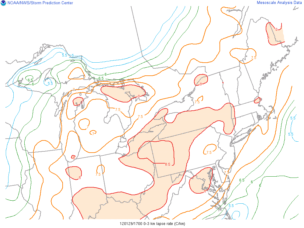 MAG5035 Posted January 29, 2012 Author Share Posted January 29, 2012 HBG cashed in all spring/summer/fall with these squal lines (we are still picking up trees from 'em). Doubt this can make it still impressively over the range, but I hope it can. When you see low and mid level lapse rates like these, you can pretty much render the Allegheny front a moot point. Although given the timing, you might lose some of the daytime heating farther east. Still though, this is going to be interesting to watch unfold. Low level lapses already over 8ºC/km with the daytime heating and the cold pool with mid level lapses over 8ºC/km is starting to press into PA. Thats crazy.. especially the mid levels. Low level Mid level Link to comment Share on other sites More sharing options...