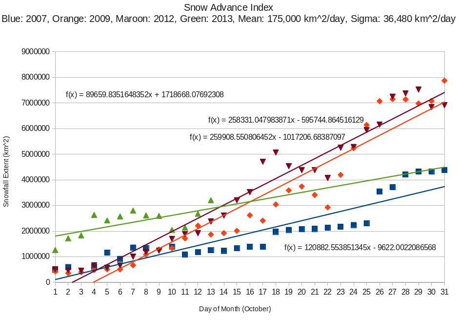 Sunny and Warm Posted October 8, 2013 Share Posted October 8, 2013 Here's the Eurasian snowcover (between 30 and 60 degrees North) for the first 7 days of October. The SAI has a small sample size (1998 to present). Within that sample, I don't believe there are any years that have started as anomalously high as this year. I think we are in unprecedented territory in regard to the SAI. where did you find that product? thanks Link to comment Share on other sites More sharing options...