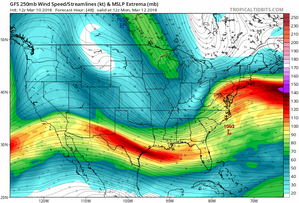 eurojosh Posted March 10, 2018 Share Posted March 10, 2018 This storm should be called the Felix storm because it has more lives than a cat. Anyway, looking at the GFS, what strikes me is the odd leap back towards the coast the LP takes between 54-60. At the upper levels there seem to be two things driving that. The first is the steering flow at 250mb. Look at how it cuts underneath the LP, pushing it back towards the coast: Compare that to previous runs that didn't create a coastal, like yesterday's 12z: The steering flow is further north and runs right into the LP, pushing it offshore. The second factor I noticed is on the other side - the north (need to post separately due to size limits)... Link to comment Share on other sites More sharing options...