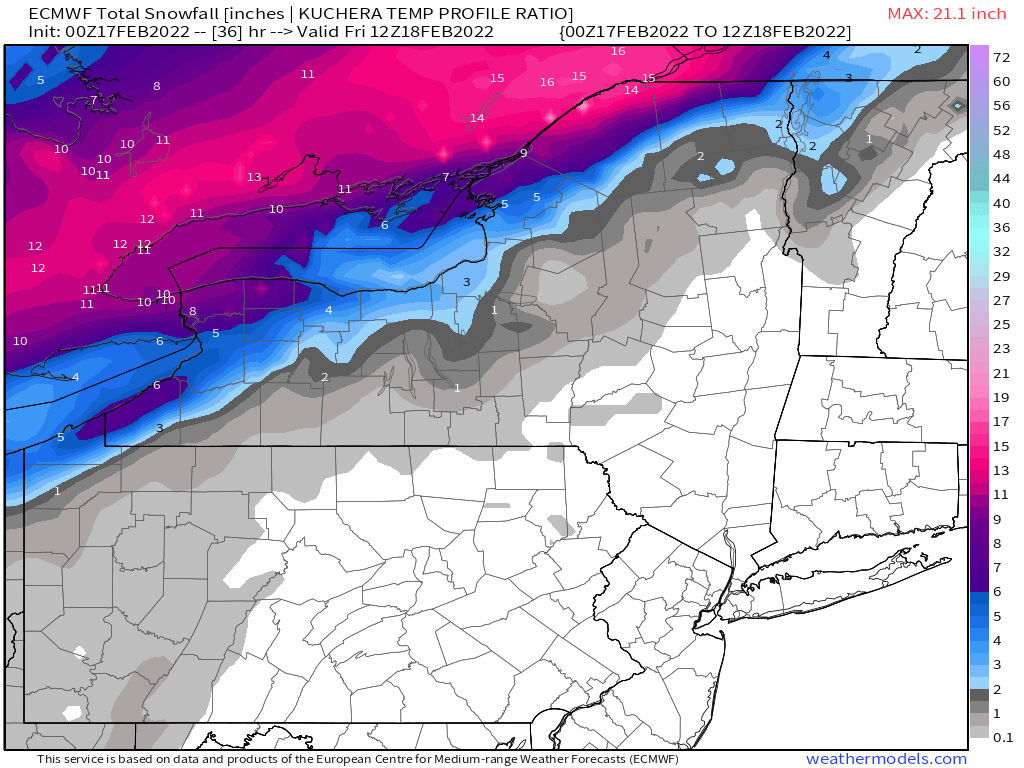 BuffaloWeather Posted February 17, 2022 Author Share Posted February 17, 2022 As far as snow amounts go, there will be a very sharp drop off in snow amounts with the southern edge of heavier snow bisecting the northern portion of the CWA. Expect 4-7" of snow across Niagara and Orleans counties and possibly far northern Jefferson County as well. If precipitation changes to all snow fast enough, low end warning amounts of over 7" cannot be ruled out in this area. The next row of counties south, including Chautauqua, Erie, Genesee, Monroe may see 2-4" of snow, with less than 2" from the interior Southern Tier to the western Finger Lakes and counties southeast of Lake Ontario. The southern edge of heavier snow amounts will be very sensitive to the position and timing of the front, but the past few model runs have been fairly consistent. For ice amounts, expect 0.10"-0.20" across much of Western NY and the North Country, less than 0.10" from the interior Southern Tier into the western Finger Lakes and points southeast of Lake Ontario. Precipitation rates will be quite heavy during the freezing rain, so there will likely be more QPF falling as freezing rain than these numbers. High precipitation rates in freezing rain results in very inefficient conversion to ice, with a large amount of runoff. Winds... SSW winds will continue to be quite gusty today, with gusts of 30-40 mph common across the area. Wind gusts will diminish with the passage of the cold front late this afternoon and evening. There will be a brief surge of stronger northerly winds overnight behind the front as colder air rushes back into the region, and this will bring gusts of 25-35 mph areawide and 40+mph along the south shore of Lake Ontario. 1 Link to comment Share on other sites More sharing options...