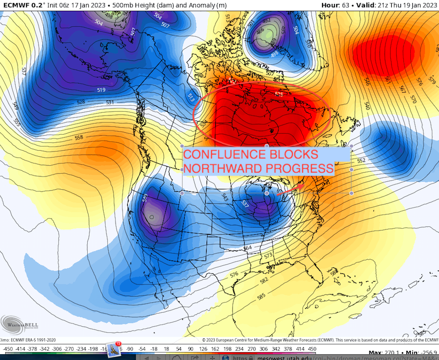 40/70 Benchmark Posted January 18, 2023 Author Share Posted January 18, 2023 Final Call for Two-Pronged Storm Thursday-Friday Mixed Bag with Most Snow North on Thursday; Light Snows Friday There continues to be some signs of change in the longer term of a season that seemingly manufactures ways to resist snow and cold throughout the forecast area, and if nothing else, the next system poised to impact the area late this week looks to serve as a reminder that wintry precipitation types are in fact still possible across the region. The Synoptic Situation: Once concept that has not been at all foreign to the 2022-2023 winter season has been deep, closed 500mb lows across the western US and midwest, which in conjunction with the notable lack of antecedent cold air, has been the reason for relative dearth of snowfall across the area. This week does not appear to be any different in that regard. On Thursday morning yet another deep H5 low is forecast to be barreling to the northwest, through the midwest and towards the Great Lakes. However, as potentially a sign of the changes that are underway across the hemisphere, the system encounters an increasing amount of resistance with latitude by way of confluence stationed over southern Canada. This forces the energy to weaken and sheer of to the east, which mitigates the degree of warming that would have otherwise taken place across the northeast. This results in the core of the mid level energy sliding on an ESE trajectory through New York state and across southern New Hampshire. It is along and just to the north of this track where the heaviest snowfall totals will be observed, as warm air advection will maximize lift to enhance precipitation without the precipitation actually transitioning to sleet and rainfall. Additionally, as the core of the upper level energy traverses the are on Friday, a second round of precipitation should break out across the area and that looks to primarily fall in the form of snowfall. Expected Storm Evolution: The storm system will occur in two parts. Round 1 The first portion on Thursday will be triggered by the lift associated with warm air advection from the southwest in the upper levels of the atmosphere, as the upper leve low approaches from the west. Precipitation from round one should break out as mainly rain on Thursday afternoon, with potentially a mix of snow at the onset in hills of NW Connecticut before a change to rain. Precipitation will overspread the rest of the area by Friday evening as primarily rainfall, with the exception of the northern third of the state north of approximately route 2, where the Thursday evening commute may be somewhat problematic. The as warm air advection wanes in the latter stages of round one, the snow will begin to collapse back to the south towards the Mass pike area before tapering to a period of drizzle early Friday morning. The break in the precipitation will fortuitously coincide with the Friday AM commute, however, motorists should be mindful of potentially dangerous freezing drizzle over the interior. Round 2 Light snowfall should begin to break out in association with the trailing upper level energy during round two on Friday afternoon, which may cause some issues for the evening commute with ill timed light additional accumulations. This is when locales south of the route two corridor will see the forecast accumulations before it begins to taper off later in the evening. And end entirely prior to midnight. Final Call: First Call: Issued 12pm Tuesday, January 17 3 1 Link to comment Share on other sites More sharing options...