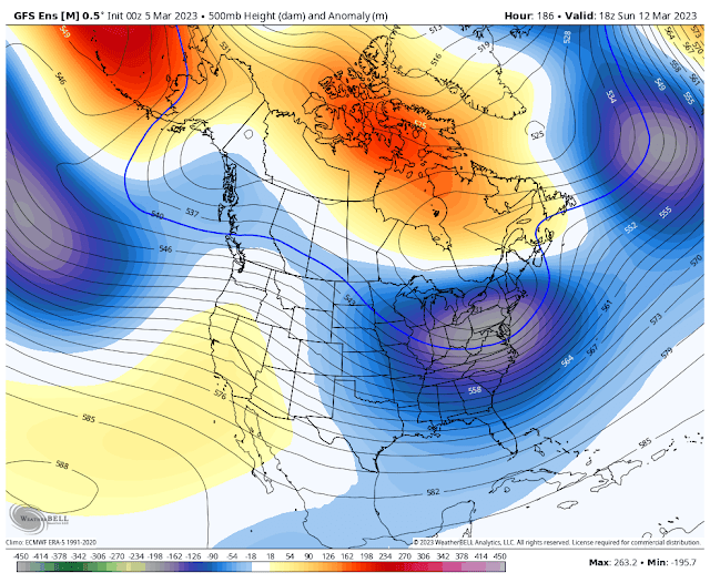 40/70 Benchmark Posted March 5, 2023 Author Share Posted March 5, 2023 Major Storm Potential Looks Next Weekend Protracted Ordeal Possible Thus far in the early going, the month of March is setting a feverish pace to the regional weather, and early indications are that this may continue next weekend. Cross Ensemble Consensus Supported by Teleconnector Convergence All three major ensemble camps are in agreement that a potent piece of Pacific energy is gong to eject out of the western US over the course of the coming week, and is likely to become virtually pinned under a very congested north atlantic pattern next weekend. EPS: GEFS: GEPS (Canadien): While it is an entirely fruitless endeavor to discuss specifics at this time, this is the type of regime that has bred very intense winter storms in the past, most notably March of 1956, which is a season that has been referenced frequently as a potential late season analog. The potential period of interest is also coincides with a period of mass flux that is evident among both the Pacific: And arctic domain spaces: Which bolsters confidence that this time frame as it increased risk for a major event because this is the type of mass flux on a hemispheric scale that often triggers many of the regions most prolific winter storms. Stay tuned for updates later this week if deemed appropriate. Link to comment Share on other sites More sharing options...