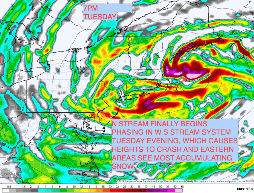 40/70 Benchmark Posted February 25, 2023 Author Share Posted February 25, 2023 First Call for Significant But Not Major Tuesday Snowfall Subtle Changes at High Latitudes Limit Potential Eastern Mass Weather began to sound the alarms on Wednesday for a March lion that had the potential to be one of the larger storms of this decade, and at the very least the largest of this season. It now can confidently state that it will be the latter and here is why. The Synoptic Situation: What has not changed is that a very vigorous piece of energy still looks to eject out of the southwestern US on Monday and head towards the area. However, it now appears as though the system will run out ahead of the polar vortex (PV) that had been trying to feed into the back side on some of the guidance earlier this week. What has also changed is that heights over the southeastern US are slightly higher than originally modeled, which creates more of a shearing compressed flow and causes the system to attenuate on approach. This is an enormous change because it now means that the system will weaken a great deal on approach, instead of intensifying due to phasing with PV energy feeding into the backside. The reason why is apparent when comparing the last night's GFS model image valid Wednesday AM with the image from the same time from Euro ensemble suite on Wednesday afternoon. Note 4 subtle, but crucial differences: 1) The blocking over Greenland is now weaker and further east, which causes..... 2) The 50/50 low portion of the north atlantic dipole to also be displaced to the east, which causes... 3) The lead system ejecting out of the southwest and approaching the northeast to run out of ahead the PV energy that not feed into the backside, as it looked as though it may earlier in the week. 4) Finally, the NAO block being weaker and slightly further east (1) allows for slightly stronger southeast ridging, which creates more of a shearing compressed gradient between the lower heights associated with the cold over southeastern Canada. The GFS guidance had a much better handle on this earlier this week. Note how much more similar this forecast chart from Wednesday is to what is currently modeled Thus instead of phasing tremendous energy into the backside of the system on approach, it is remaining discrete and attenuating in a compressed flow. The difference is that some storm now becomes merely some storm that will be vanquished from memory faster than a meager snowpack under every increasing March irradiance. Expected Storm Evolution: Snow will overspread southwestern New England late Monday evening. And the rest of the region during the overnight and predawn hours early Tuesday AM. Its possible that some sleet may mix with snowfall near the south coast of Connecticut towards dawn on Tuesday and limit accumulations somewhat, but precipitation should fall as primarily snowfall in an area that has seen just about none thus far this season. Another ramification of the blocking displaced to the east is that the primary low over ontario is allowed to remain dominant for a longer period of time, which causes an onshore flow that could limit accumulations somewhat over eastern areas. This is especially true over the cape and islands, where snowfall will ultimately change to rain. Precipitation should taper off by tuesday evening, as the secondary low becomes dominant and pulls away to the east. First Call: Final Call will to be issued on Monday- 1 Link to comment Share on other sites More sharing options...