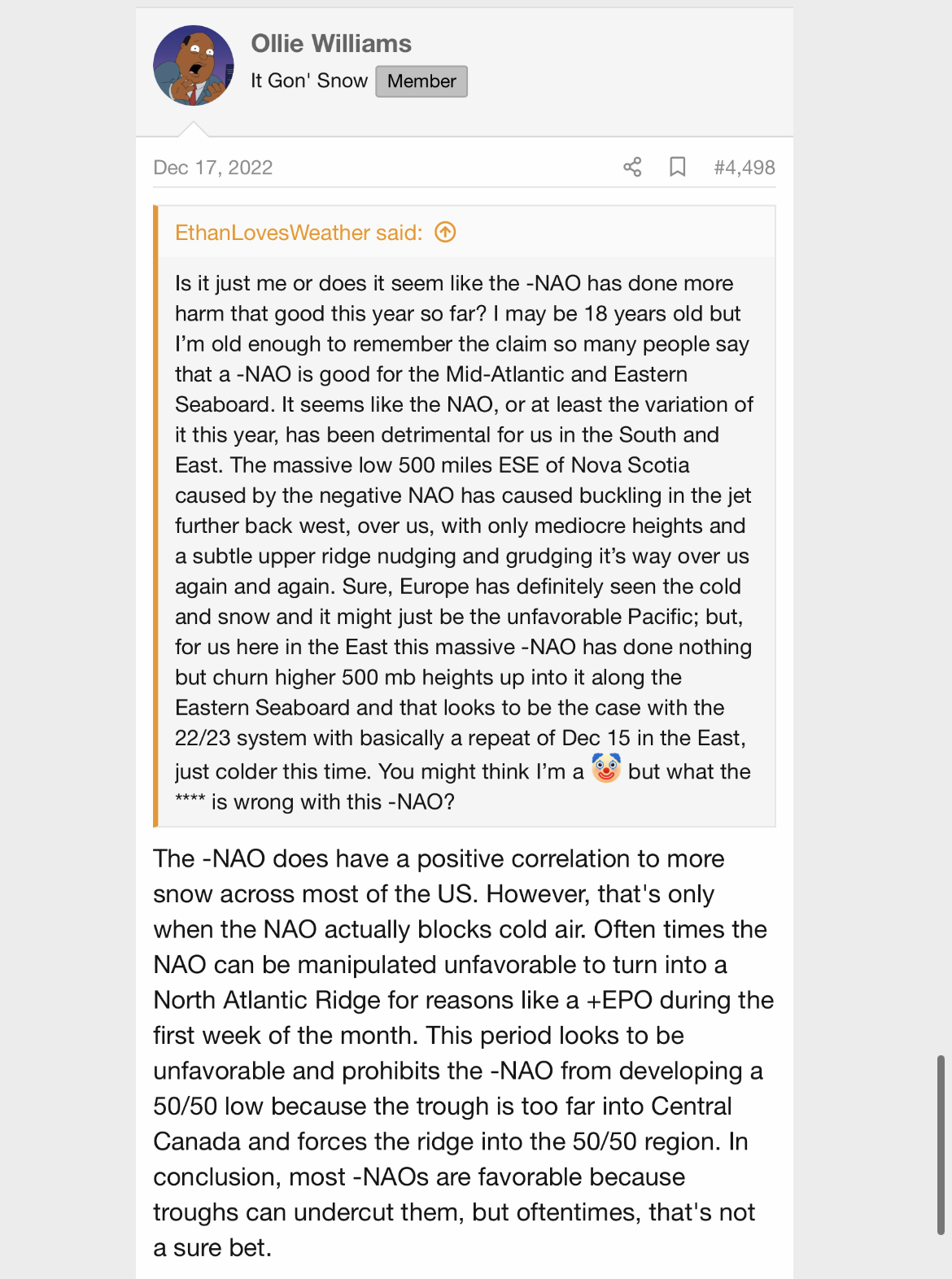 EastTNWeatherAdmirer Posted December 27, 2022 Share Posted December 27, 2022 Here is one response I got on Southern WX when I inquired about the NAO earlier this month. Basically, yeah it’s the absence of the 50/50 low which was caused trouble and this is because the block over the HB region is much less closed off than it was in 2010. Here are some more images which help to tell the story: 1 Link to comment Share on other sites More sharing options...