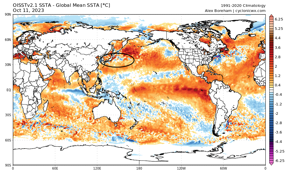 Terpeast Posted October 12, 2023 Share Posted October 12, 2023 Pacific continues to change. Marine heatwave off Japan is starting to break, and some of that heat is getting displaced to the NE of Japan towards the aleutians. Strong cooling is still taking place from Japan all the way out to south of the aleutians. Typhoon is modeled to recurve towards the aleutians, which may help dissipate some of that warmth up there. The only problem is that stubborn high to the NW of Hawaii. Ensembles seem to break it down past day 10, but since it's beyond day 10, we'll have to wait and see on that. 2 Link to comment Share on other sites More sharing options...