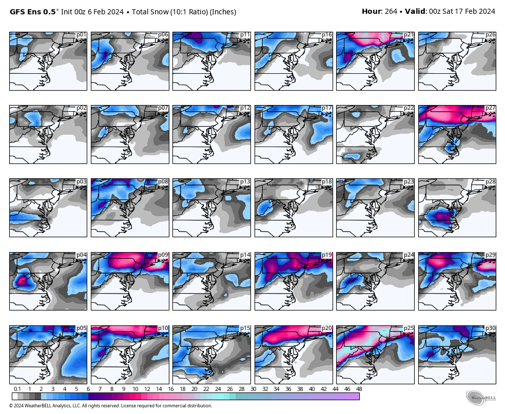 RIC Airport Posted February 6, 2024 Author Share Posted February 6, 2024 21 minutes ago, RIC Airport said: The 00z Euro picks up on the 00z GFS idea as well. 6z GFS shifted back north. You can see when looking at the 500mb vorticity maps that the vortex over Canada is farther north over Hudson Bay than the 00z run, and there are some slight timing differences with the northern and southern stream energy before they phase compared to the 00z run. This is still 6-7 days out, so the details will probably change. FWIW, the 6z ensembles, only 2 or 3 members seem to like the snow idea, even for NoVa/DMV. The 1st map shows a loop starting 00z Saturday 2/10 to 00z Friday 2/16, and notice how only p10, p16, and p19 are the closest to what the 00z GFS showed. Link to comment Share on other sites More sharing options...