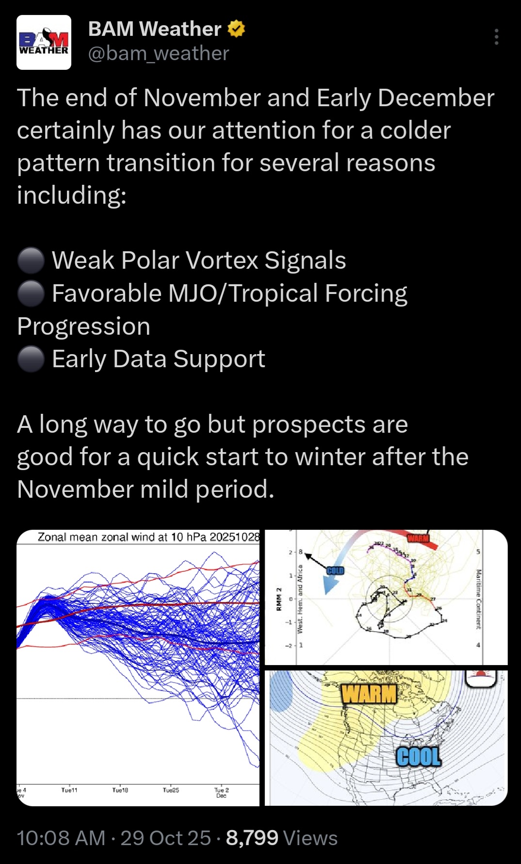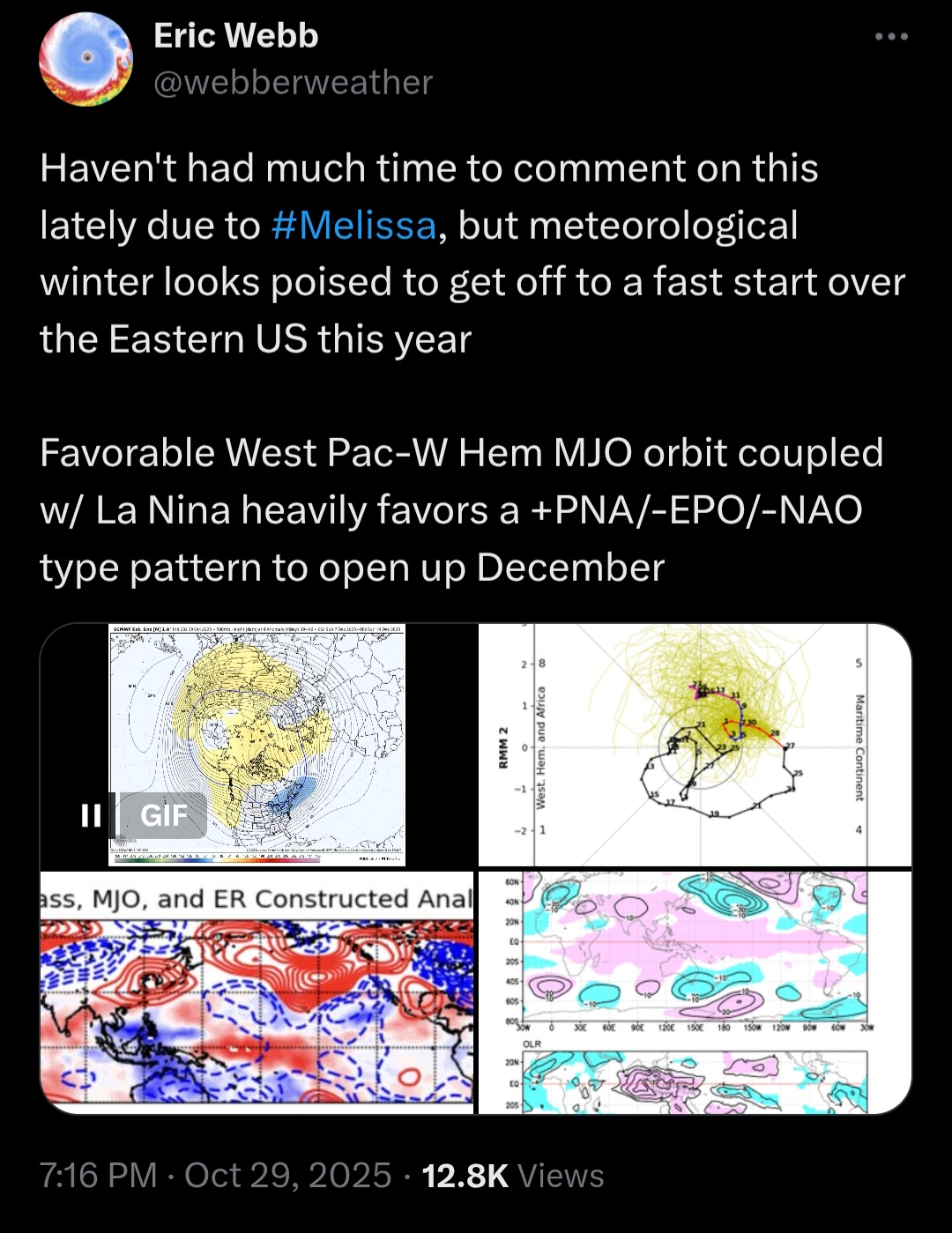 stadiumwave Posted 4 hours ago Share Posted 4 hours ago 12 hours ago, snowman19 said: I have no doubt that the MJO gets into phase 6. My question is, what happens when it gets into phase 7? As we have seen time and time again over the years, the models inaccurately project it barreling right through phase 7, 8 and 1 with amplitude only to be have it die in phase 7. Definitely something to watch going forward later on in November @bluewave Last 2 winters it has a hard time getting into phase 8. This might continue. Link to comment Share on other sites More sharing options...