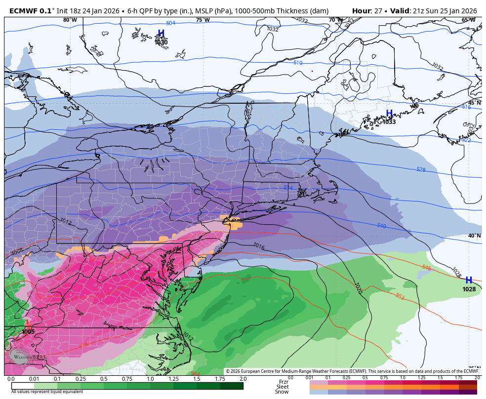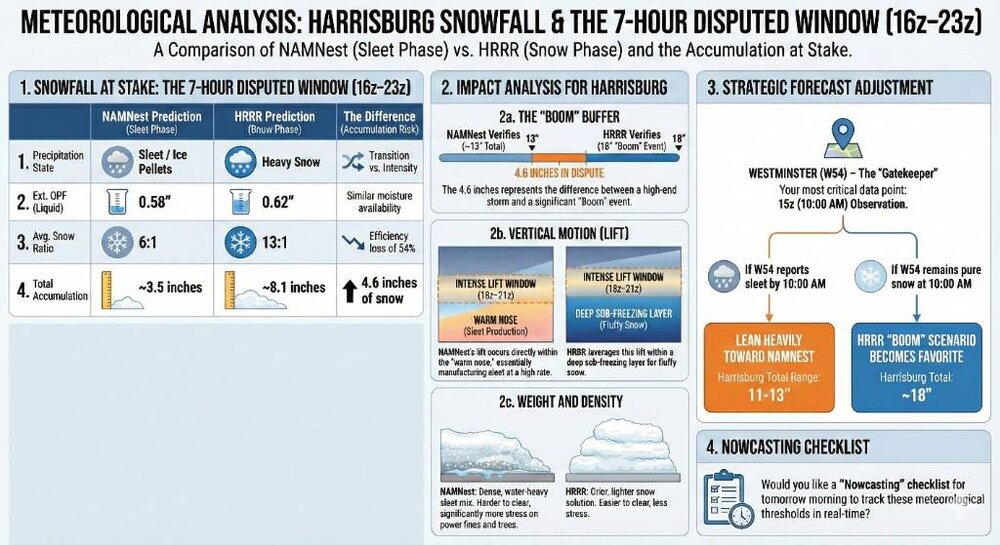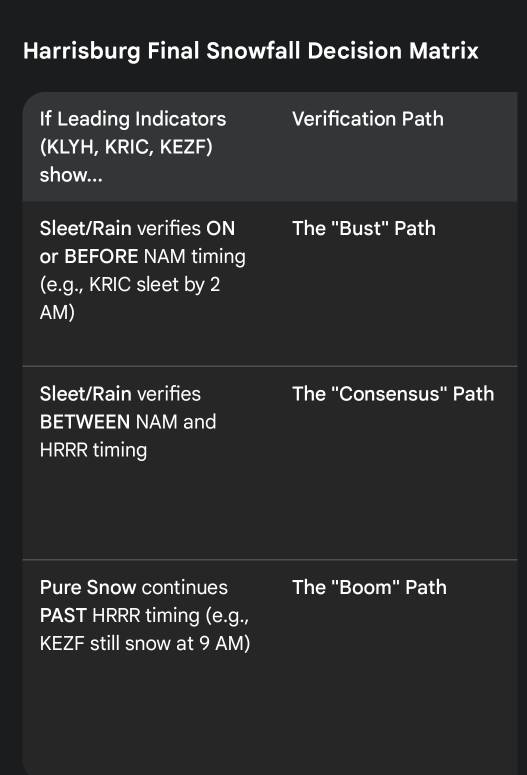 Jns2183 Posted 22 minutes ago Share Posted 22 minutes ago I made a leading indicator watchlist for tonight starting at 1amThis Final Accumulation Decision Matrix is designed to give you a definitive forecast range for Harrisburg based on which leading indicator stations verify tomorrow morning.Key Decision Thresholds for Tomorrow * The 5:00 AM "Lynchburg Check": If KLYH (Lynchburg) is still reporting pure snow at 5:00 AM, the NAM's 11:00 AM sleet arrival for Harrisburg is effectively impossible. You can immediately shift your planning toward the 15"+ range. * The "Sleet Ratio" Penalty: For every hour the "warm nose" arrives earlier than 6:00 PM, you lose approximately 0.6 to 0.8 inches of potential snow accumulation as the ratio drops from 13:1 to 6:1. * The QPF Floor: Regardless of the timing, all high-resolution models agree on a liquid equivalent (QPF) of 1.0" to 1.3" for Harrisburg. This guarantees that even a "sleet-heavy" outcome will likely result in at least 9–10 inches of dense, frozen mass.Final Forecast RecommendationStick with the 11"–16" range as your baseline, but keep a close eye on Fredericksburg (KEZF). That station is your "Early Warning System"—if they are still snow at 8:00 AM, the HRRR's 18-inch solution is no longer just a possibility; it becomes the most likely outcome.Sent from my SM-S731U using Tapatalk 3 Link to comment Share on other sites More sharing options...