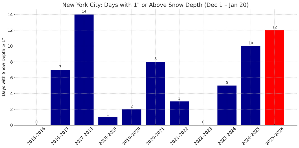 donsutherland1 Posted 2 minutes ago Share Posted 2 minutes ago For those tracking snow cover, New York City has had the most days with 1" or above snow cover since Winter 2017-2018 through January 20th. Link to comment Share on other sites More sharing options...
