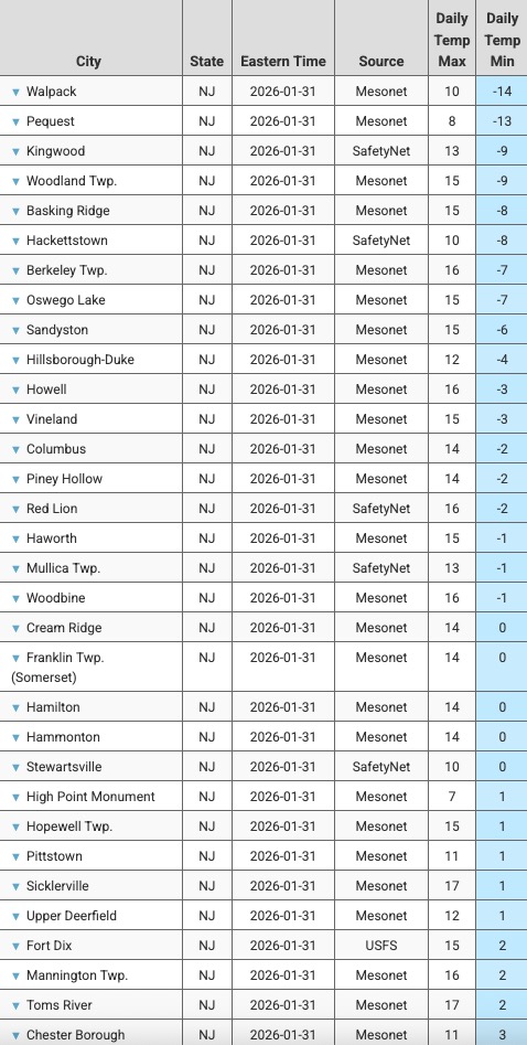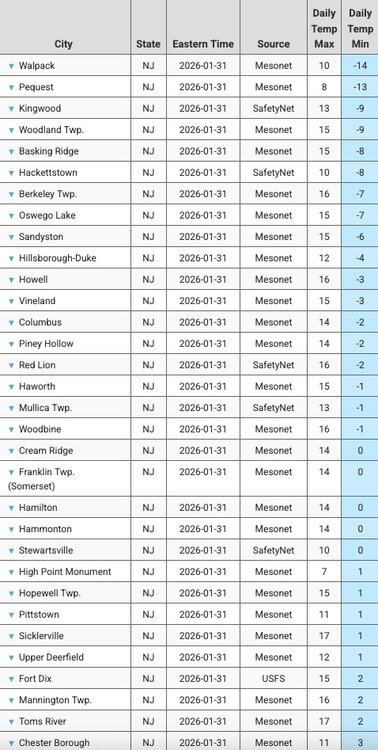 ForestHillWx Posted 21 minutes ago Share Posted 21 minutes ago 2 hours ago, TWCCraig said: +3.5°F for the low here. Looks like -2°F at Shirely and -9°F at Westhampton for lows. -8°F in Toms River -9°F in Somerville -11°F in Morristown Unofficial numbers though Impressive cold nearby; perhaps the lower elevations (MMU/Somerset) acted like a sink. 1 Link to comment Share on other sites More sharing options...