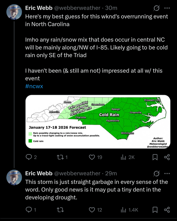 olafminesaw Posted 1 minute ago Share Posted 1 minute ago I think he could very well be right, if as usual cold air takes longer than expected to bleed over the mountains. However,I do feel we could overcome with decent rates and get a coating or so as far SE as RAH Link to comment Share on other sites More sharing options...