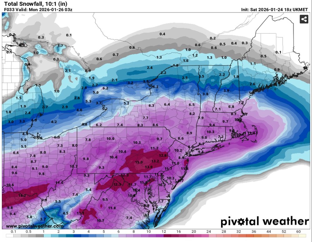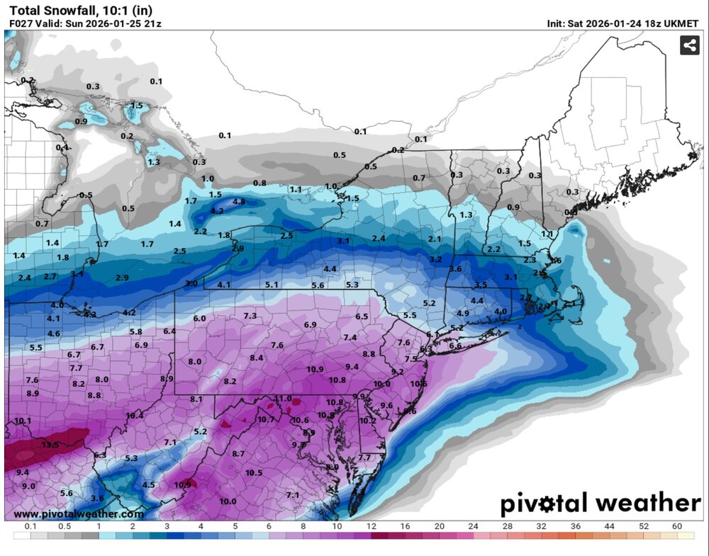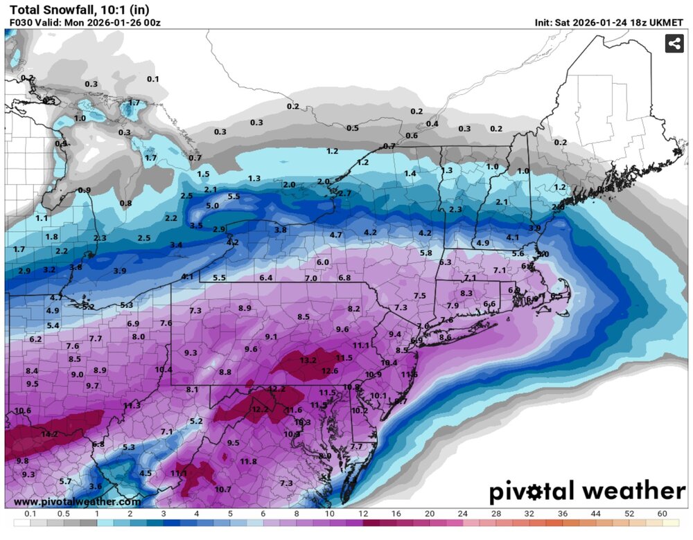 For NYC, that means the depicted ~6 inches is not a hard ceiling. In a very cold, well-saturated column, snowflakes tend to be fluffier and accumulate more efficiently, especially if rates increase under banding. In this setup, depth is driven less by raw QPF and more by how effectively the atmosphere converts that moisture into snow, and extreme cold tilts that equation in favor of higher totals.