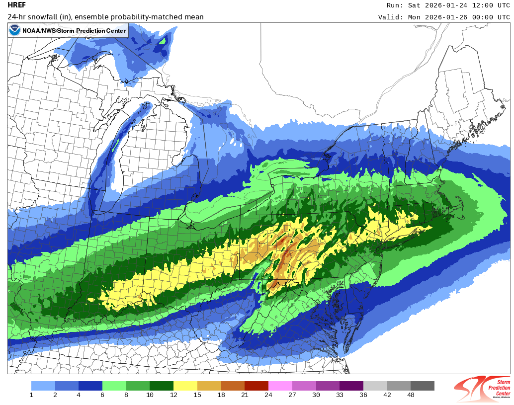 For reference, here's the map though 1/26 0z. Typically, if one reduces the amounts by a category at this lead time, it's estimate is pretty good. As snow will continue to fall in parts of the Hudson Valley after 0z, it's current listing of 12"-15" there is reasonable. I think there will be some 18" amounts there.