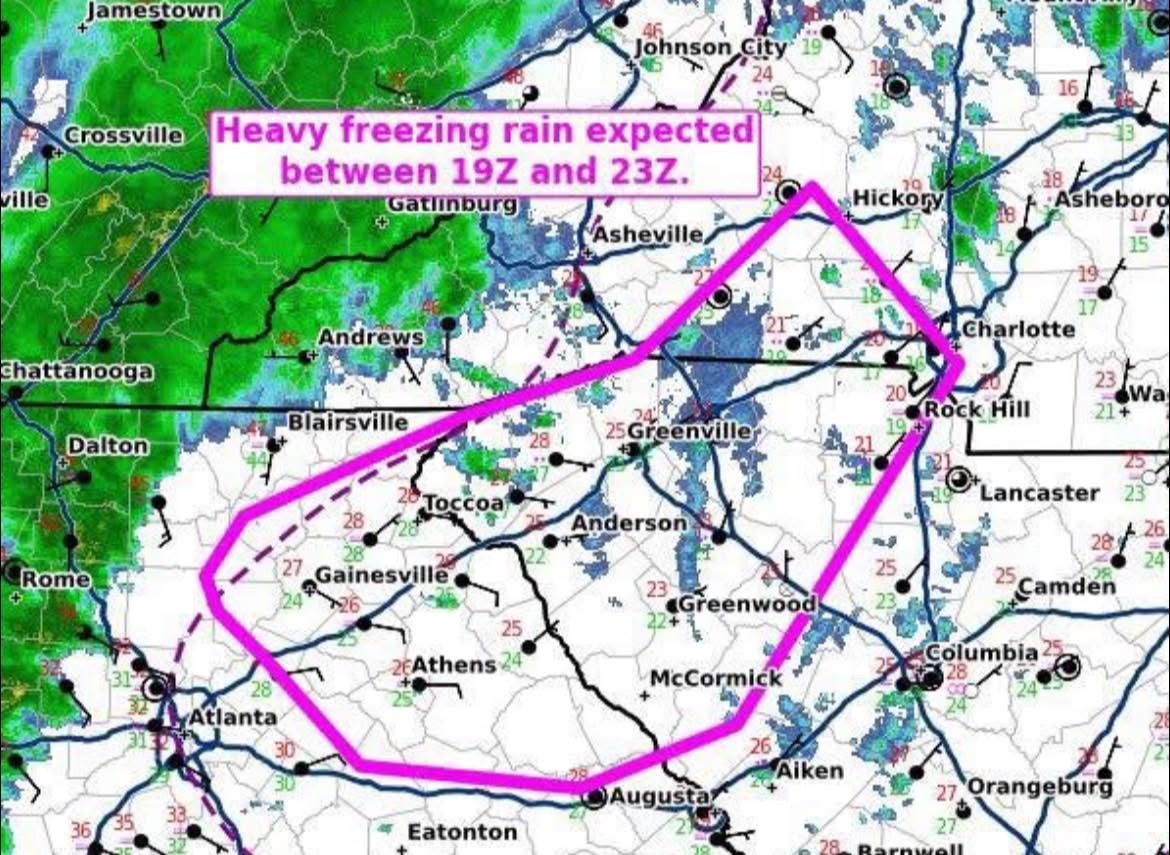 As a result, moderate to heavy precipitation with temperatures in the mid to upper 20s will result in significant ice accumulation between 19Z and 23Z from northeast Georgia into western South Carolina and into portions of southeast North Carolina. Given the expectation for relatively efficient ice accretion and QPF of 0.5 to 0.7 inches, expect another 0.25" to 0.5" of ice accretion this afternoon and early evening.