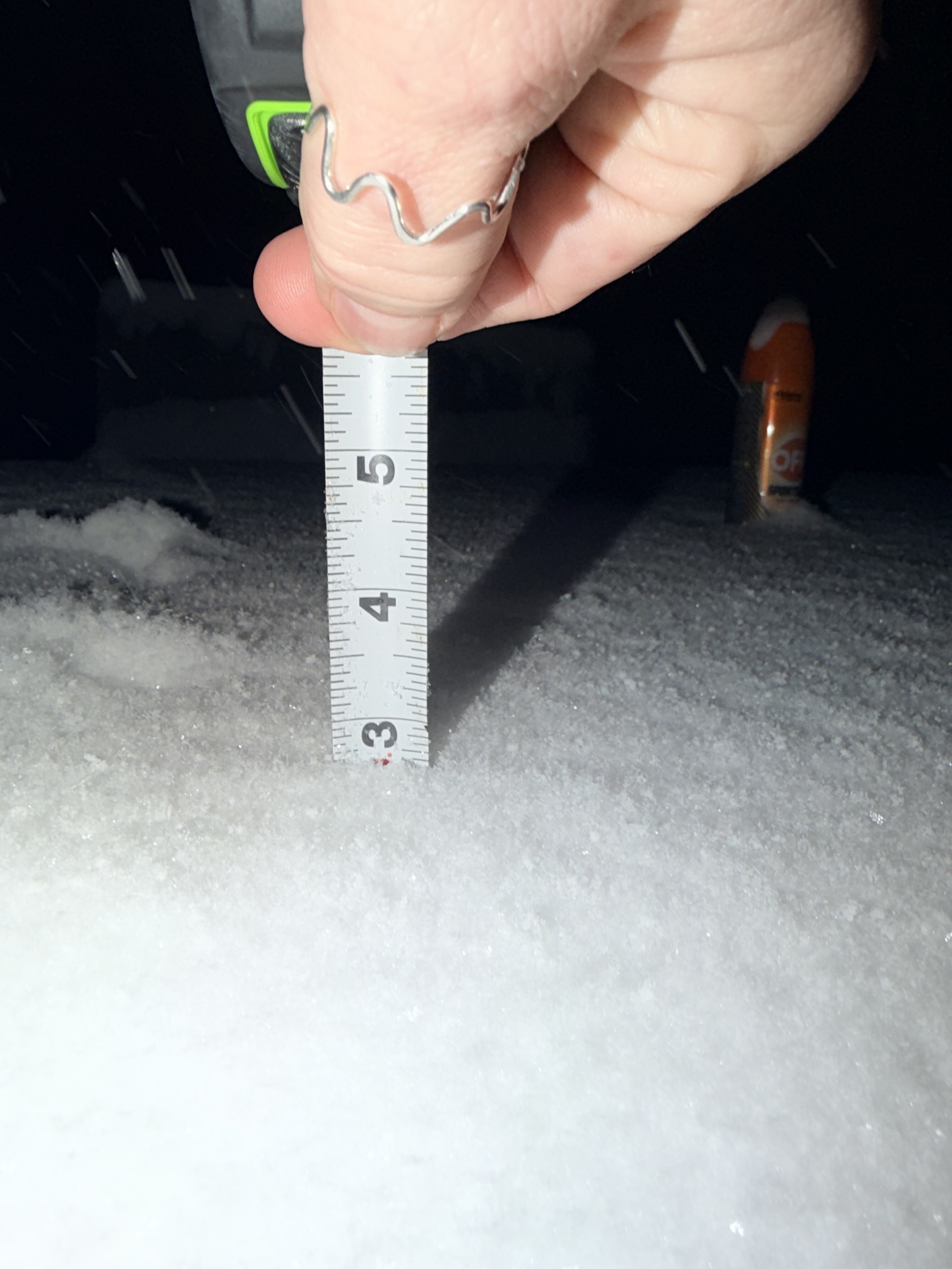 Heavy dusting here to this point with light snow still falling and a very windy 28. It’s so cool watching it blow around in the strong winds, especially coming off the roof, because of it being fluffy. Looking at the leaves/grass, some is as deep as 1/2”. But some is closer to 1/4”. So, taking the average gives me 3/8”. So, maybe call it 0.3-0.4”. The pavement is still just wet.
