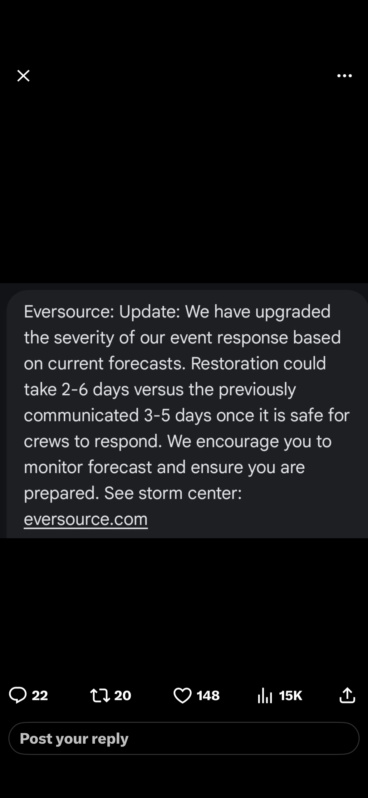 yeah I got 3 notifications in the last hour, they changed now to 2-6 days... I'm sorry, didn't we spend millions about a decade ago clearing up trees anywhere close to major transmission lines to that never happened again after 2011?? jacking rates up for it too. I understand if you're remote and it's still unworkable but at this point nobody outside a few boondocks people should be out more than 2 days